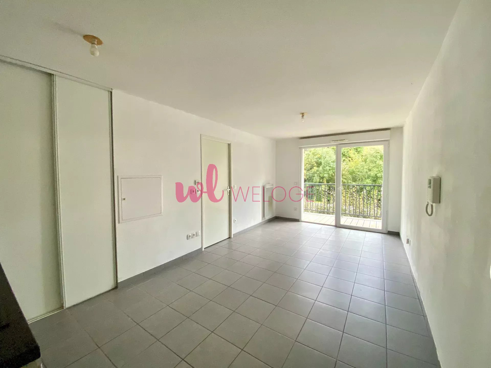 Espace de vie : Séjour lumineux avec coin cuisine, ouvrant sur un balcon exposé Sud-Ouest avec vue dégagée sur la verdure.
