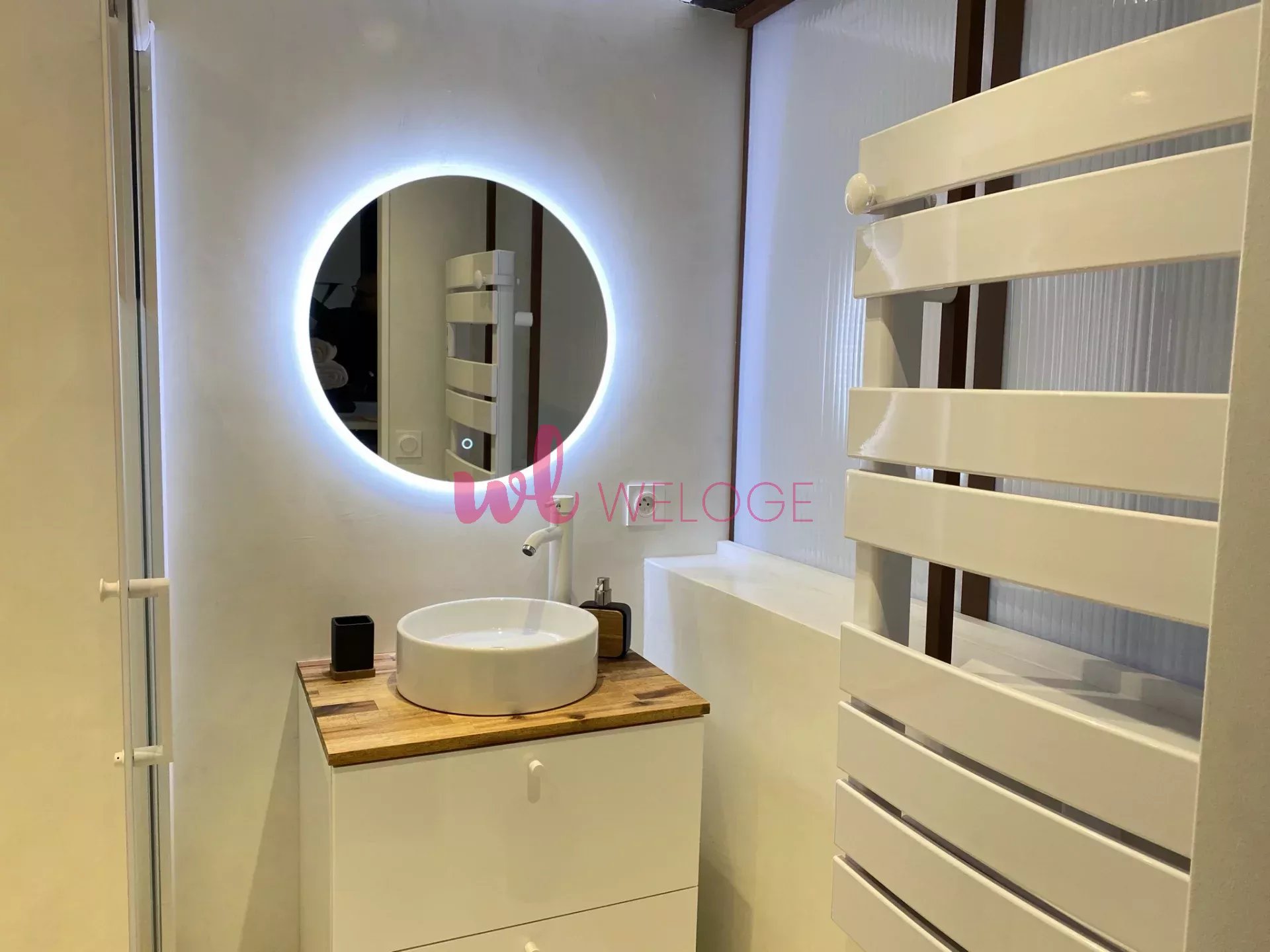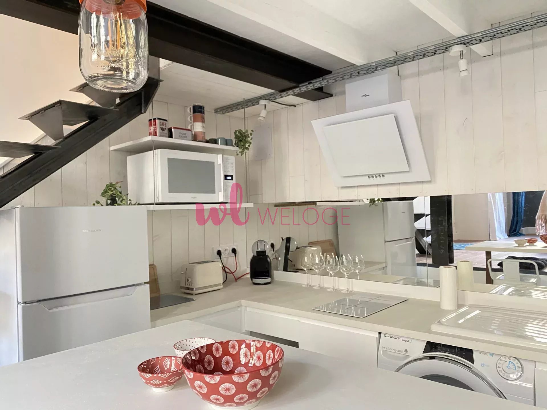 L’espace nuit est accessible par un escalier typique des lofts, et la salle d’eau complète parfaitement ce bien meublé.
