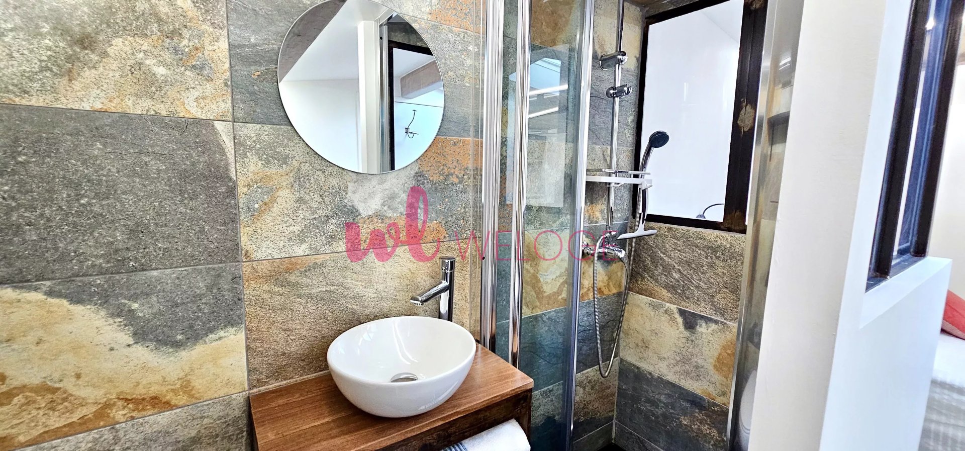 A l’étage deux chambres avec chacun sa salle d’eau et son toilettes, avec placard, bureau, TV et climatisation individuelle.
