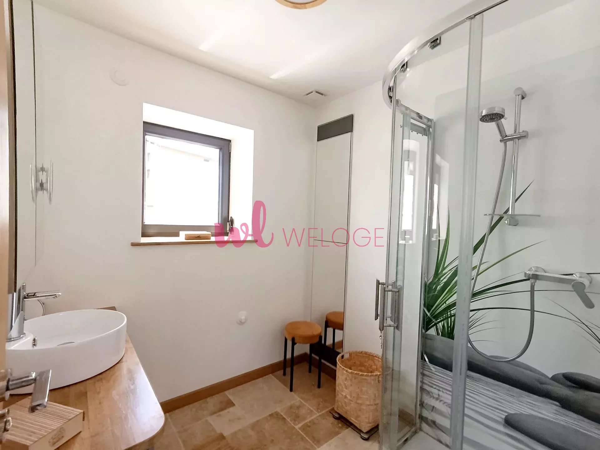 L’espace nuit propose deux chambres confortables de 12.82m² et 15 m², une salle d’eau en travertin et un toilette suspendu séparé. Toujours de plain-pied, vous trouverez également un bureau et un second toilette.