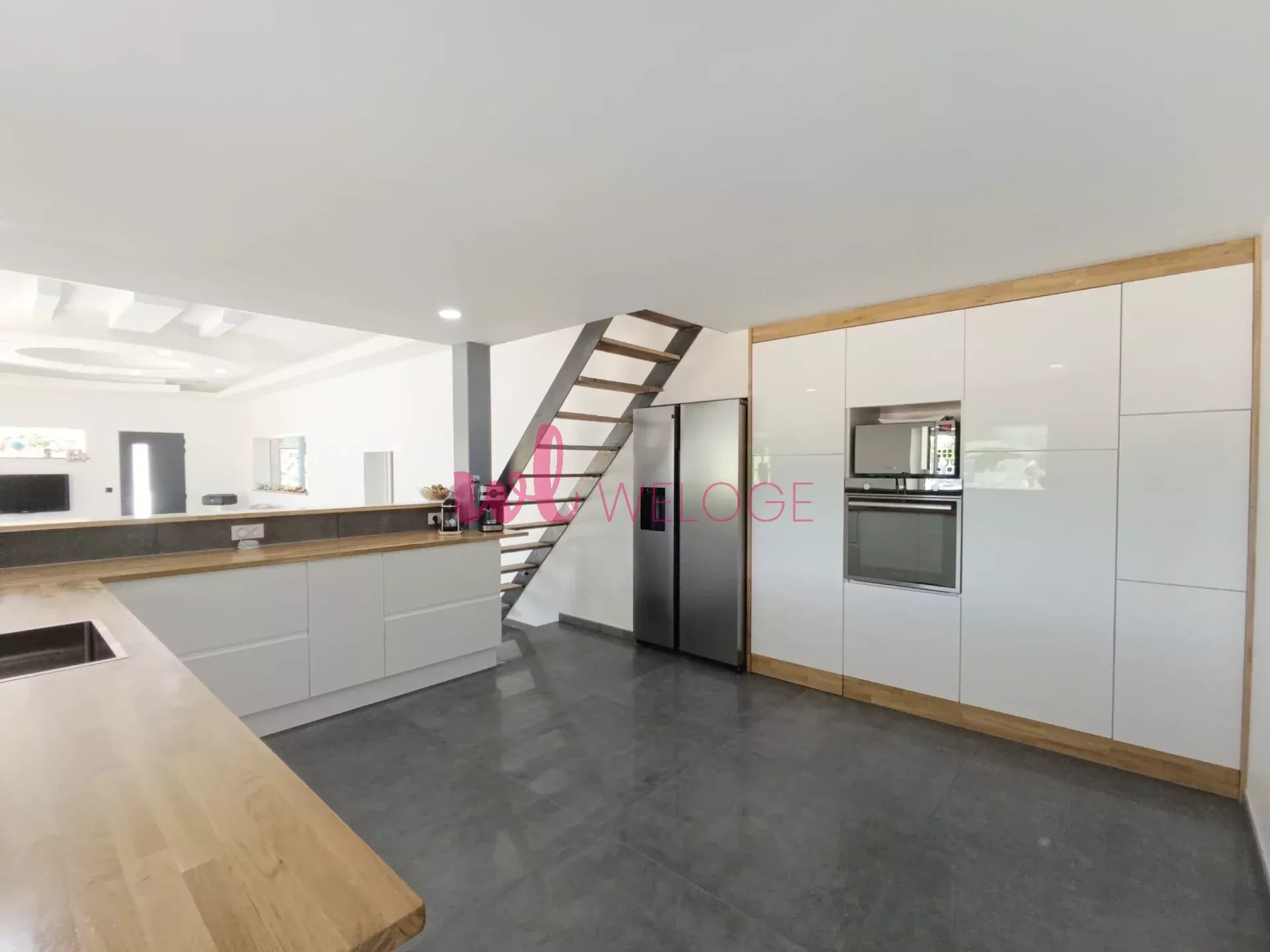 Le rez-de-chaussée accueille un vaste salon de 45 m², baigné de lumière grâce à ses grandes baies et fenêtres à galandages, ouvrant directement sur la terrasse. Dans son prolongement, une cuisine moderne de 20 m², conviviale et fonctionnelle, complétée par une arrière-cuisine avec évier, rangements et plan de travail, l’assurance d’un espace toujours impeccable.