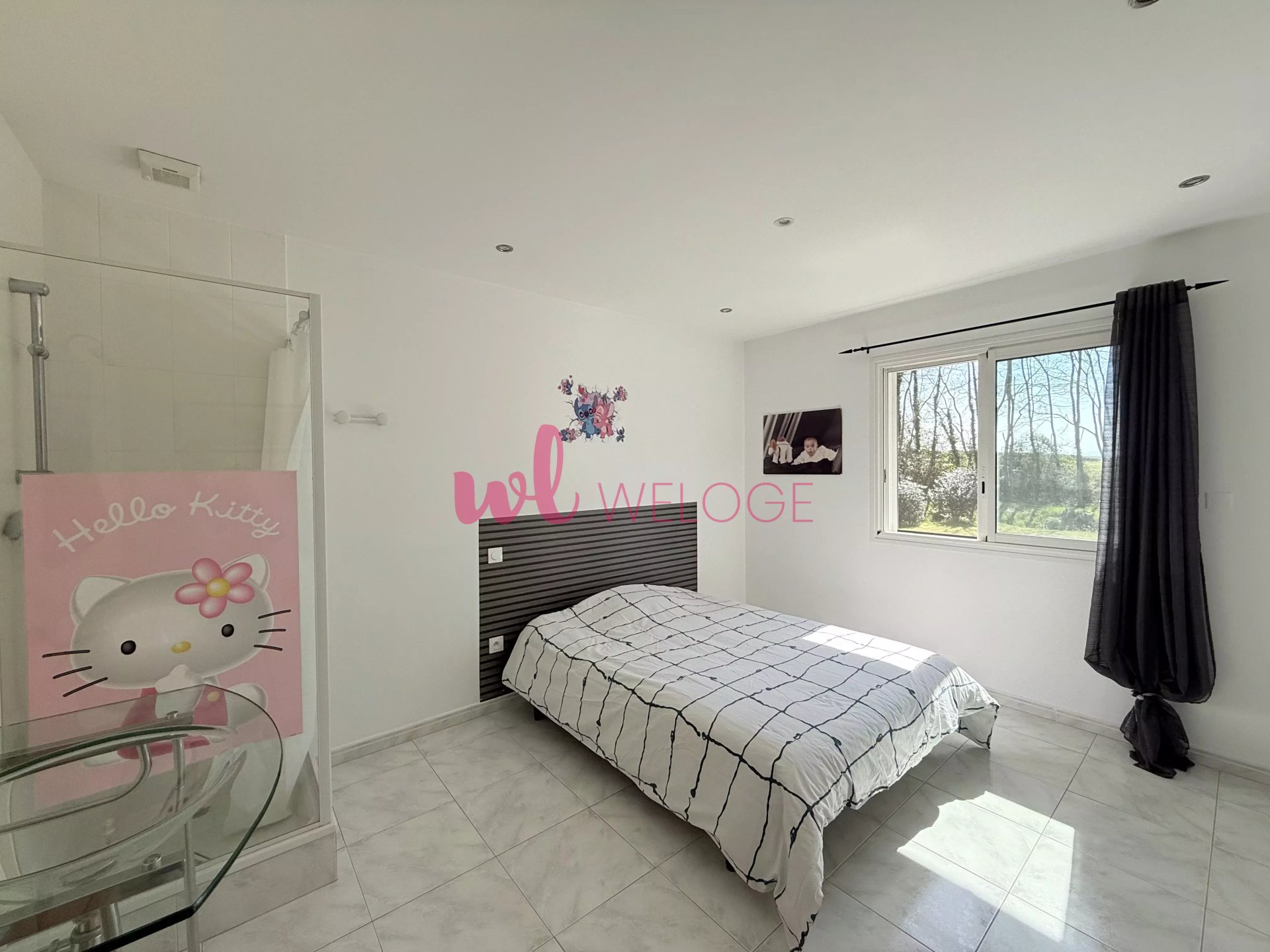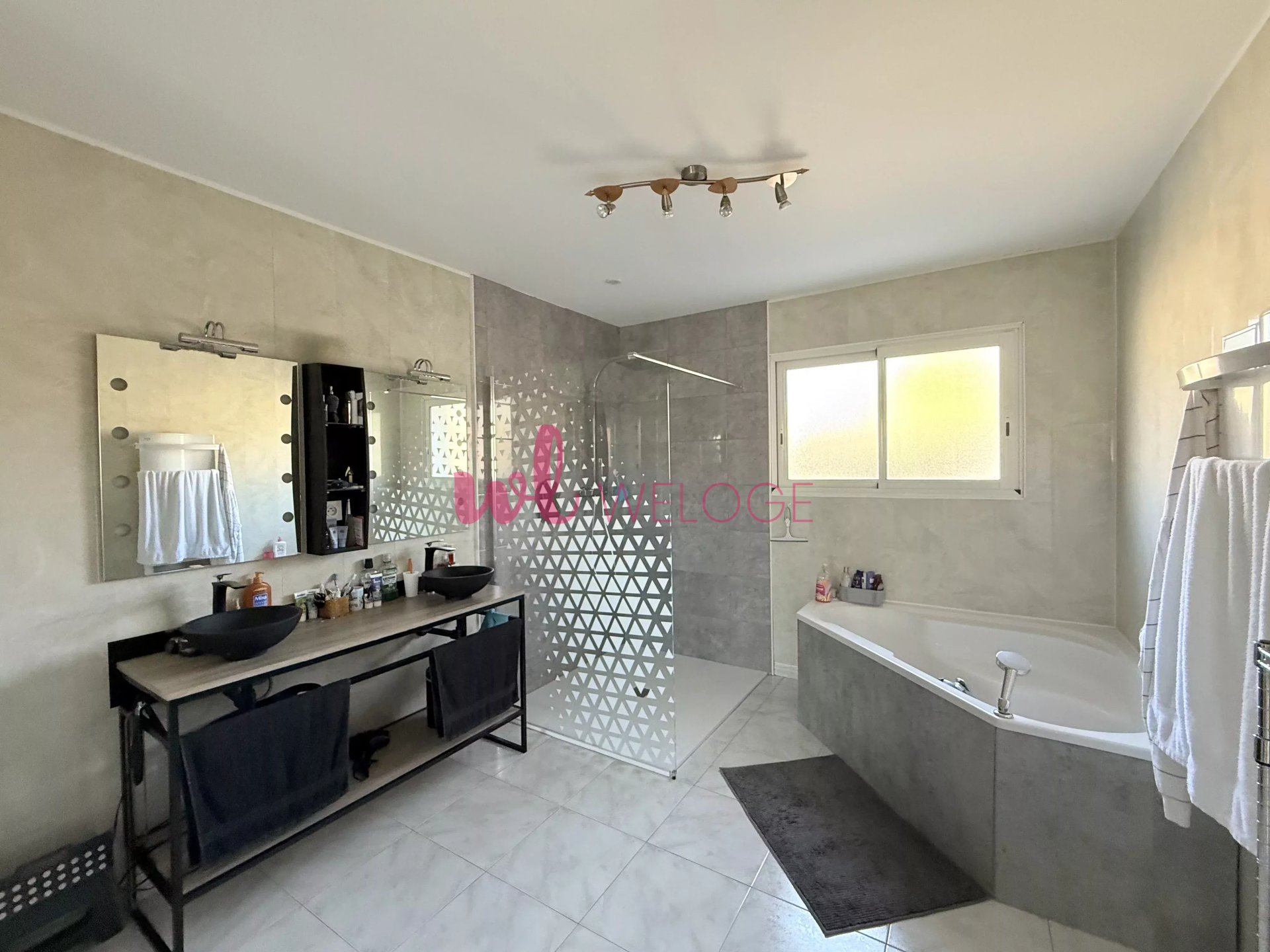 La visite se poursuit avec un espace nuit parfaitement agencé. Vous y trouverez une grande salle de bain principale comprenant baignoire d’angle, douche à l’italienne et rangements. La maison dispose également de trois belles chambres : une première de 15,25 m², ainsi que deux autres chambres de plus de 14 m², chacune bénéficiant de sa propre cabine de douche et d’une vasque privative. Une configuration idéale pour garantir confort et indépendance à toute la famille ou accueillir vos invités dans les meilleures conditions. Deux toilettes indépendants viennent compléter cet espace.