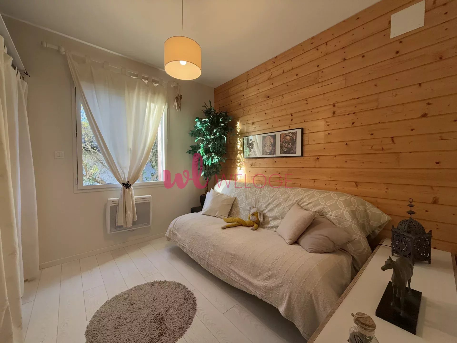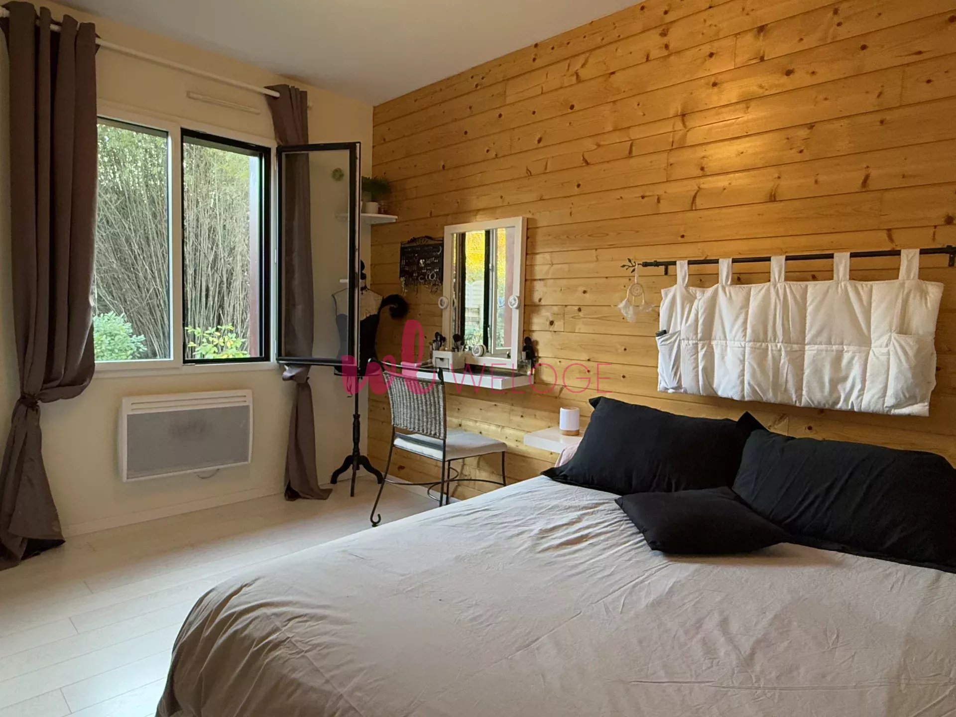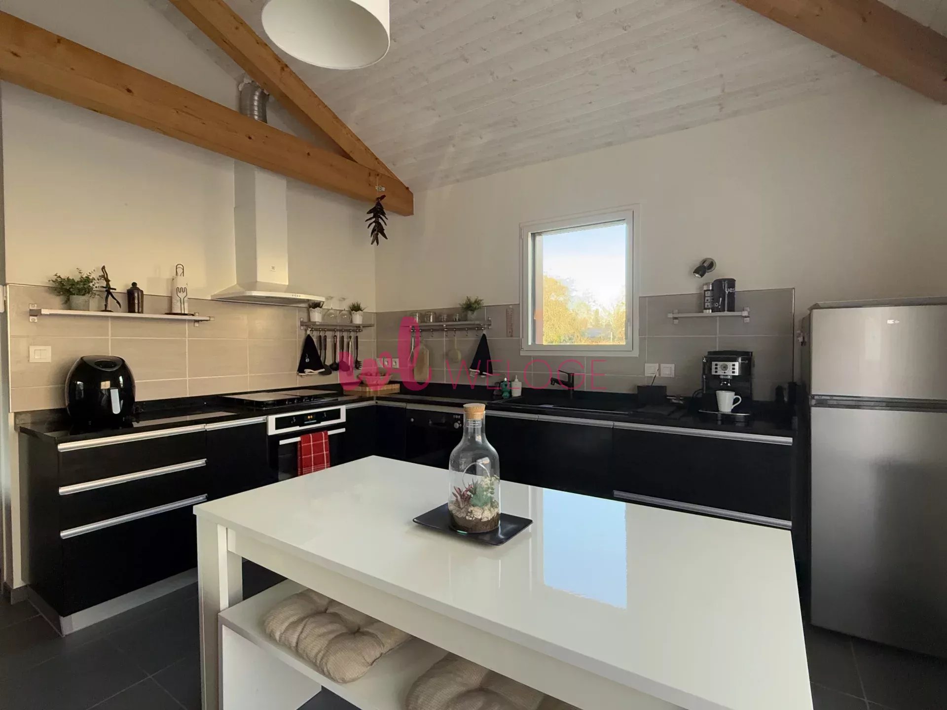 Cette maison lumineuse et joliment agencée se compose d’un séjour avec toit cathédrale et cuisine ouverte, de deux chambres, d’une pièce aménageable en dressing, chambre d’enfant ou bureau, d’une salle de bains équipée d’une double vasque et de toilettes indépendantes.