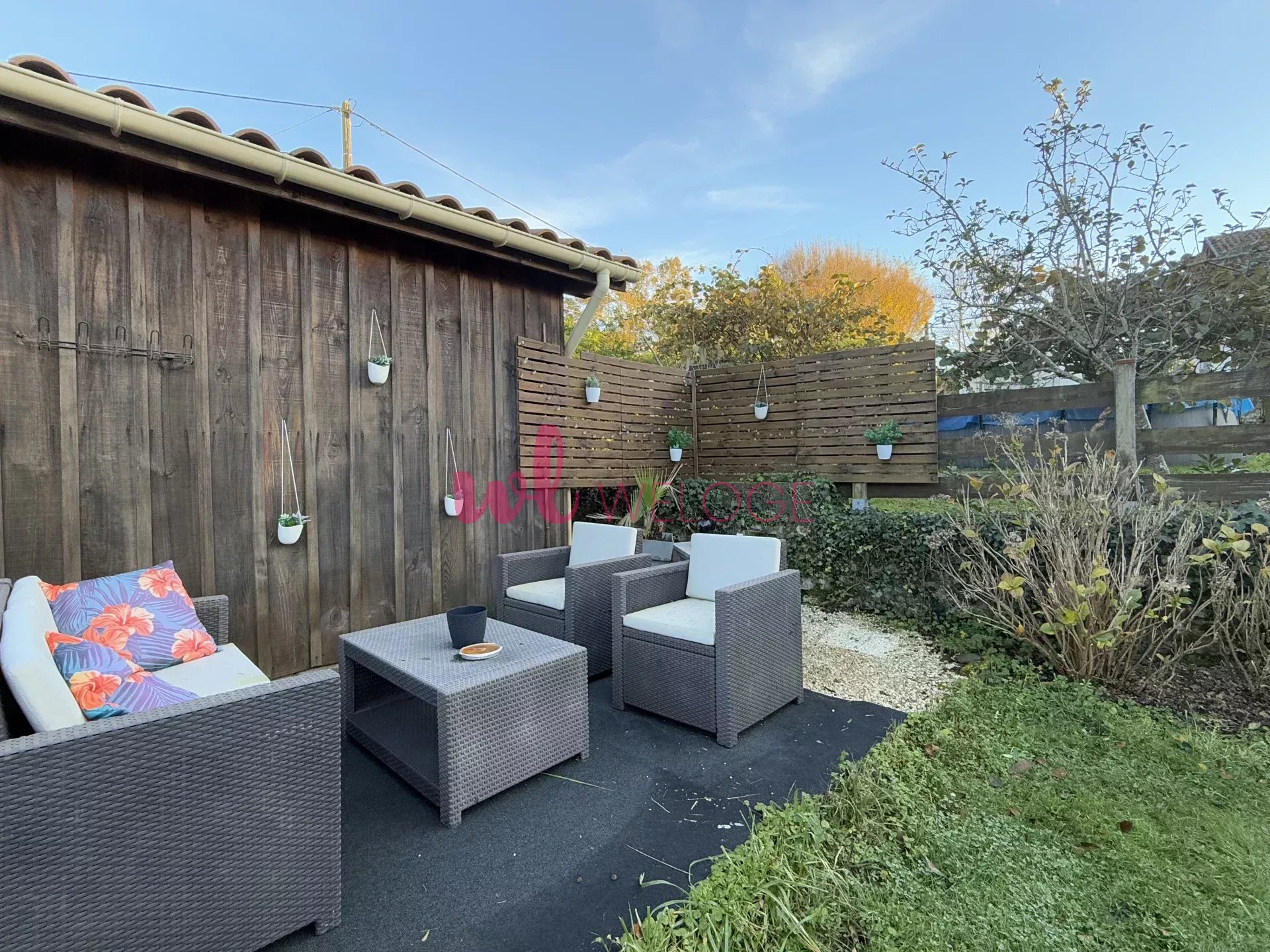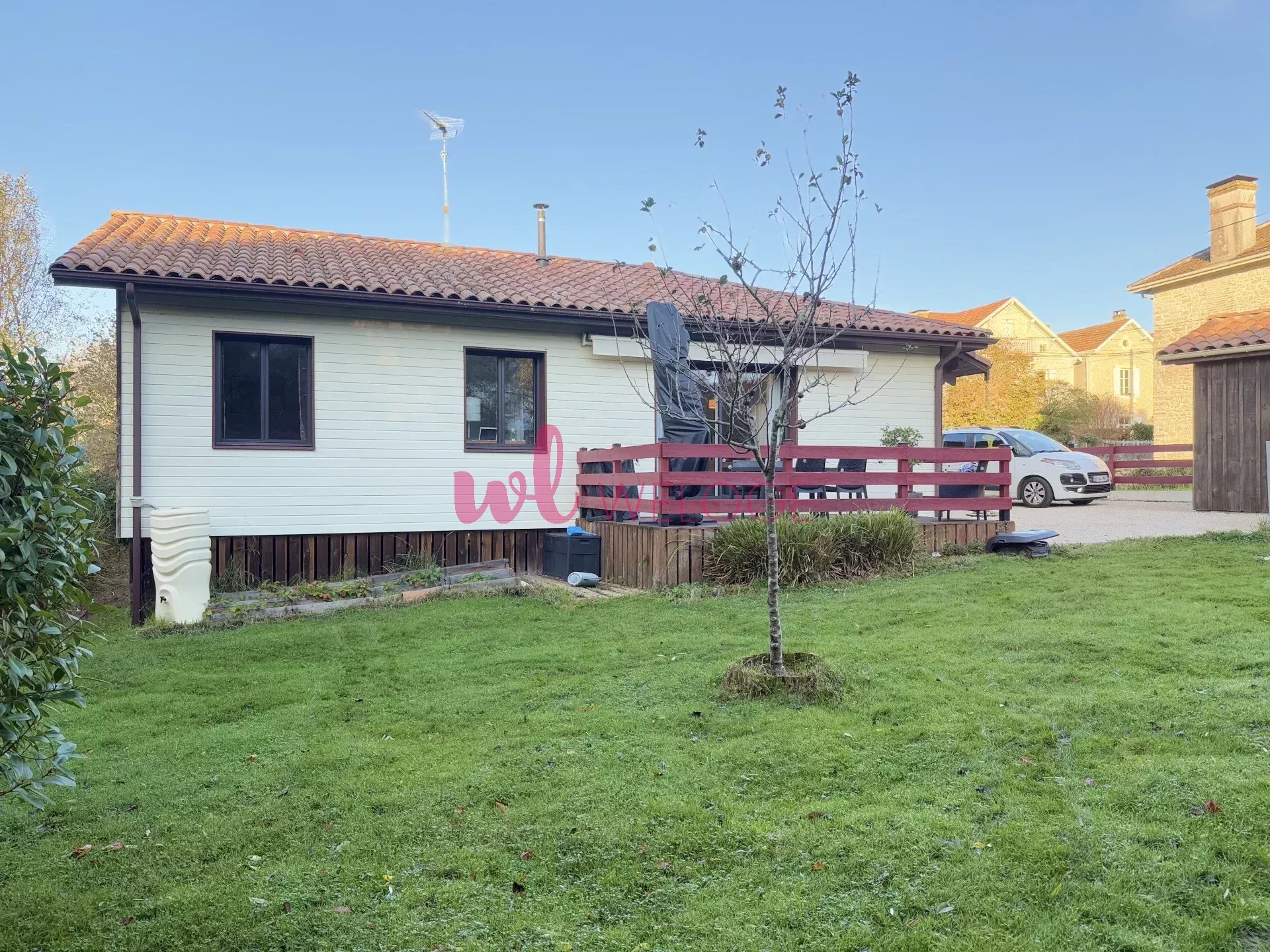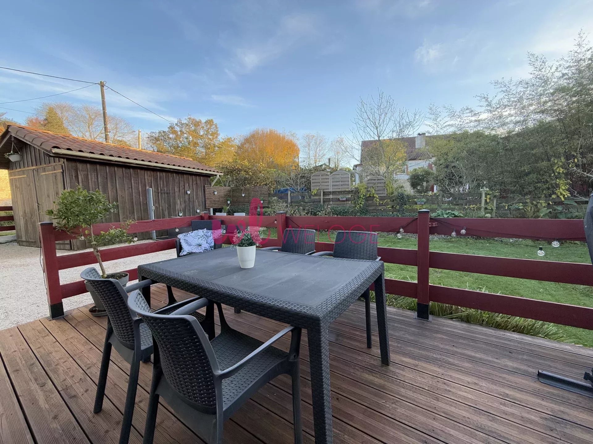 À l’extérieur, une terrasse en bois vous invite à profiter du jardin arboré, idéal pour vos moments de détente. La propriété inclut également un garage de 15 m² pour votre véhicule ou du rangement supplémentaire.