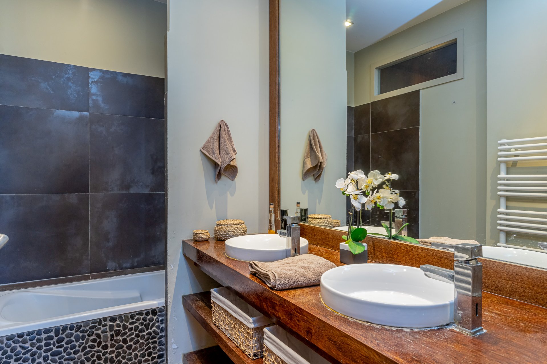 L’appartement deux pièces se compose d’une entrée, d’un séjour avec cuisine ouverte, une chambre, une salle de bains double vasque, des toilettes indépendantes avec lave mains et de nombreux rangements.