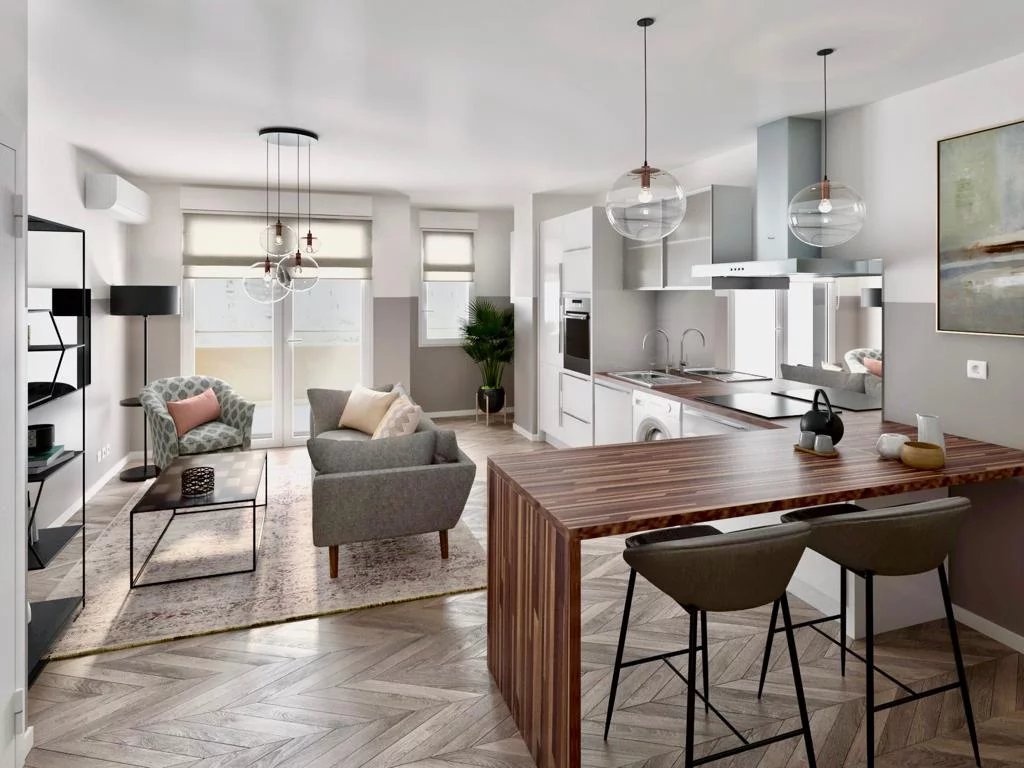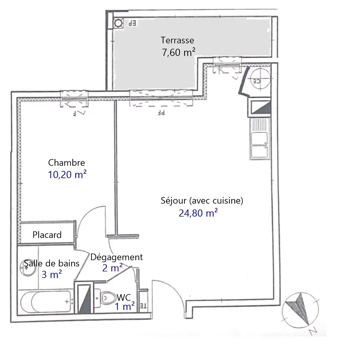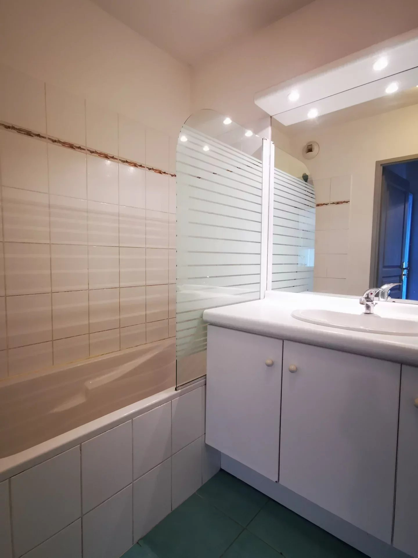 Spacieuse pièce de vie séjour/cuisine de 25 m², donnant accès à la terrasse. Le coin nuit est séparé par un vestibule distribuant la salle de bain avec baignoire et sèche serviette, le wc indépendant, la chambre avec penderie intégrée.