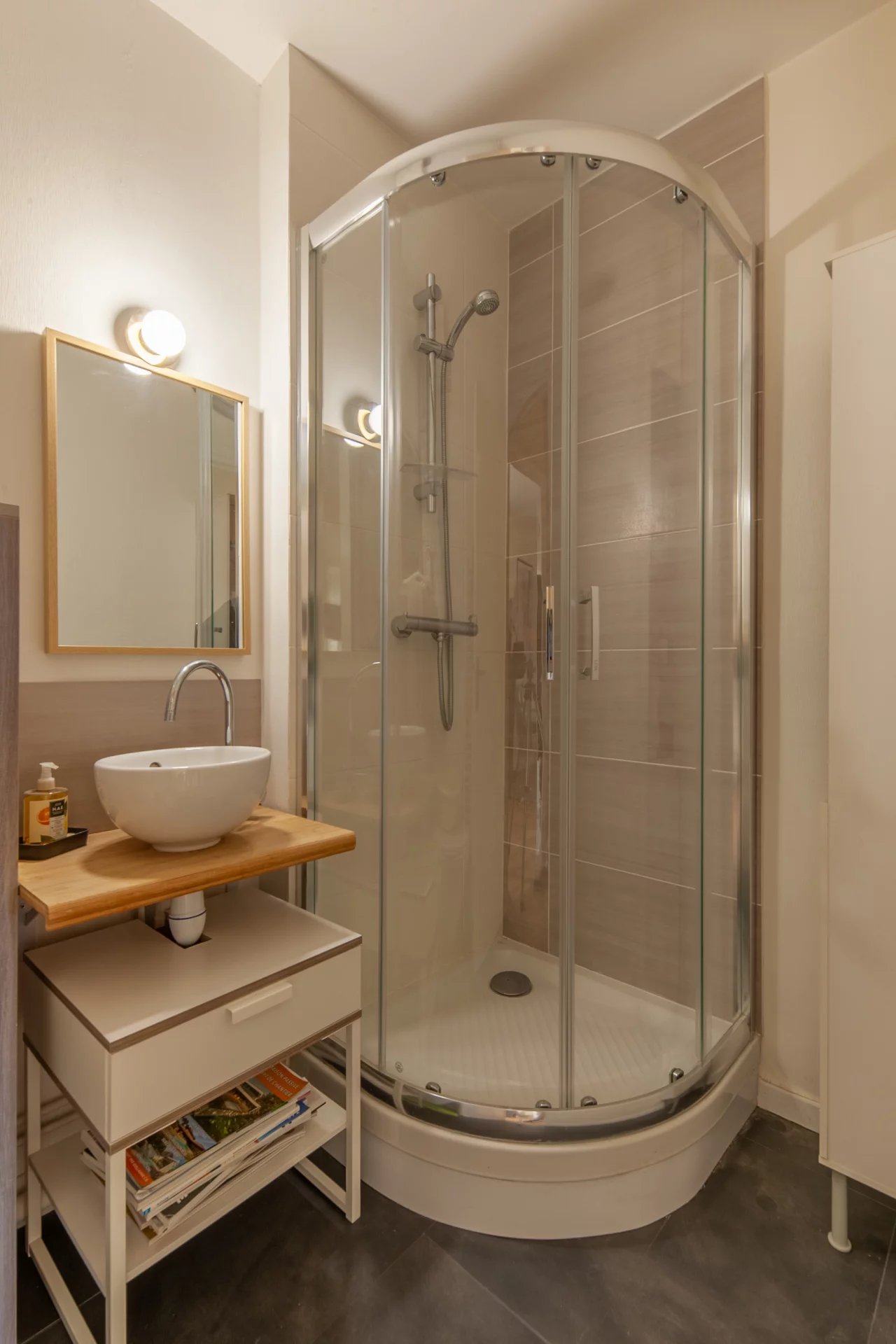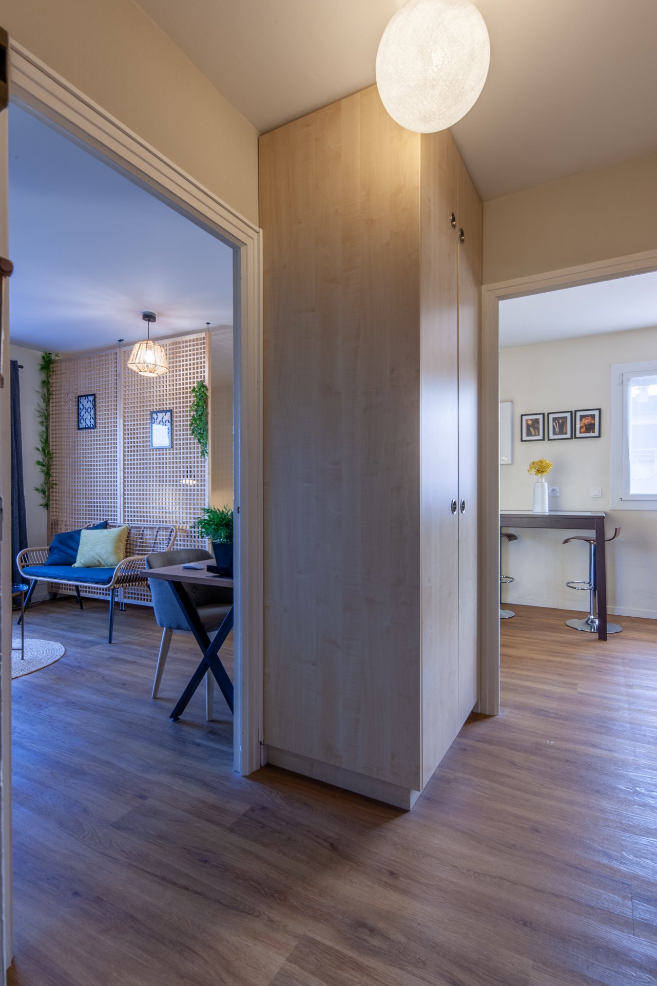 Une entrée de 3.13m2 avec un espace de rangement donnant accès à un espace ouvert de 23.06m2, laissant place au séjour et à une cuisine moderne et équipée (machine à laver, four, frigo encastrés et une plaque de cuisson) et une salle de bain avec douche et WC de 2.87M2.