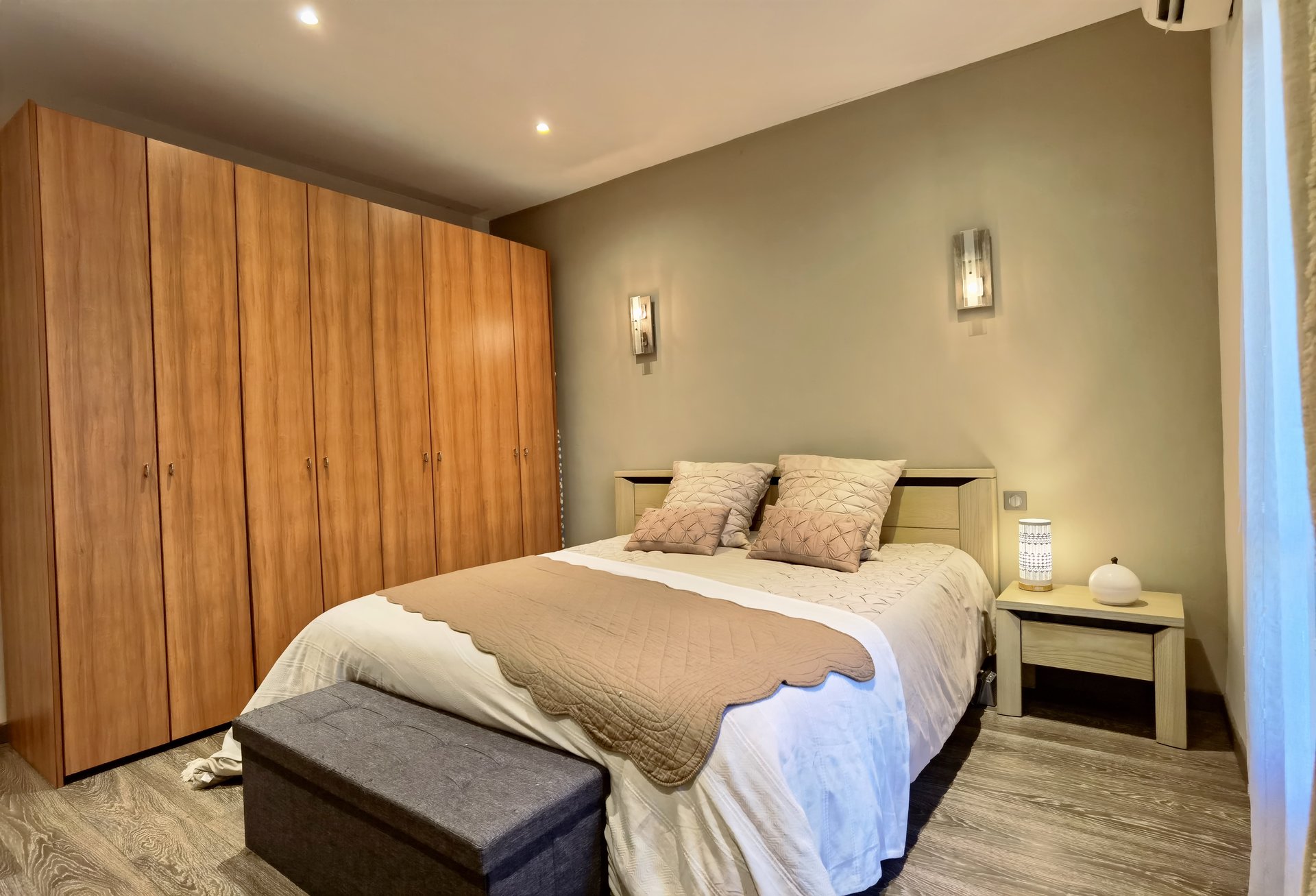 Il se compose d’un accueillant hall d’entrée desservant, un séjour de 25 m2 et une cuisine ouverte entièrement meublée et équipée de 8,63 m2. L’espace nuit se compose d’une belle salle d’eau, toilettes indépendantes, un placard de rangement et de deux chambres de 16 et 12 m2, ouvrant sur un balcon, donnant accès à un superbe jardin très bien entretenu et une terrasse couverte.