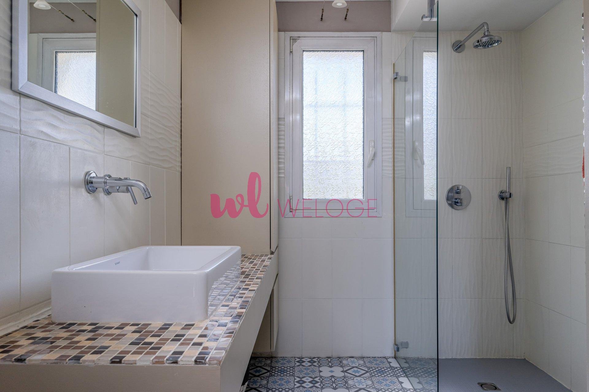 – Au rez-de-chaussée: un pièce à vivre de 27 m2 ouverte sur une spacieuse cuisine aménagée de 11m2 donnant sur une grande terrasse exposée sud de 60m2 environ entièrement carrelée, un toilette séparé et une salle de douche avec douche à l’italienne.