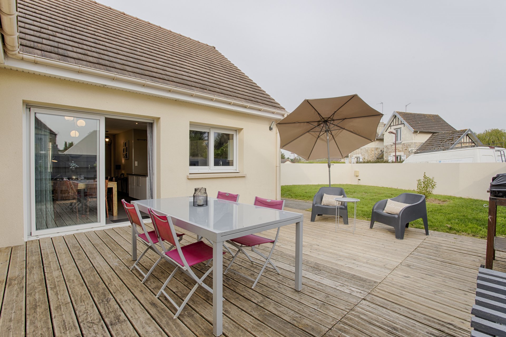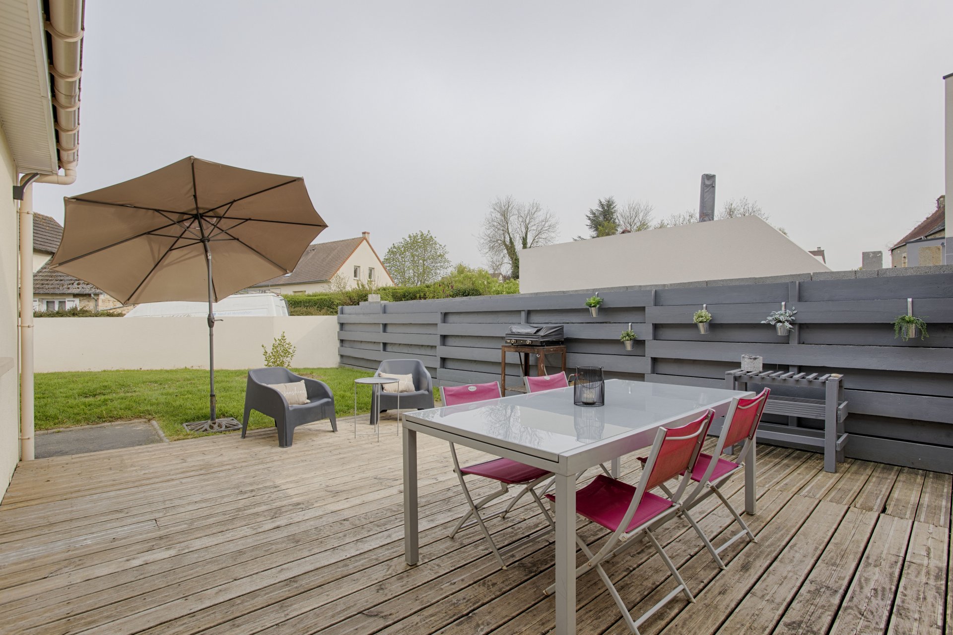 A l’extérieur : Un Jardin engazonné, agencé, clôturé avec une terrasse en bois de 35m2 exposition Sud vient agrémenter ce joli bien.
