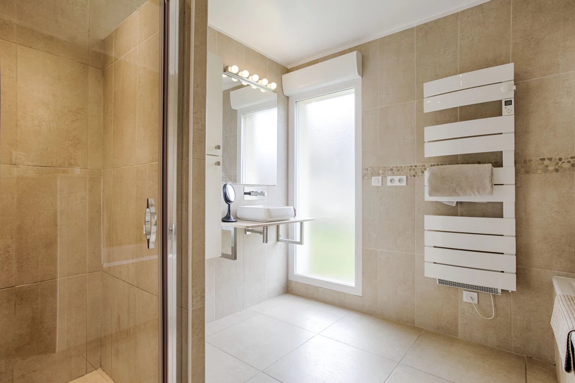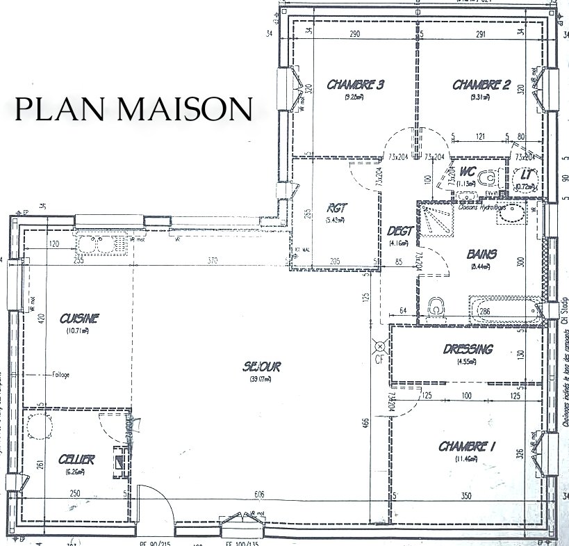 Un grand salon séjour avec une belle cuisine équipée de 50m2, un cellier avec rangements de 6.26m2, une 1ere chambre avec dressing de 16m2, un couloir desservant une SDB avec douche, baignoire et WC de 8.44m2, deux chambres de 9.37 et 9.32m2, une buanderie de 5.43m2, et un WC indépendant.