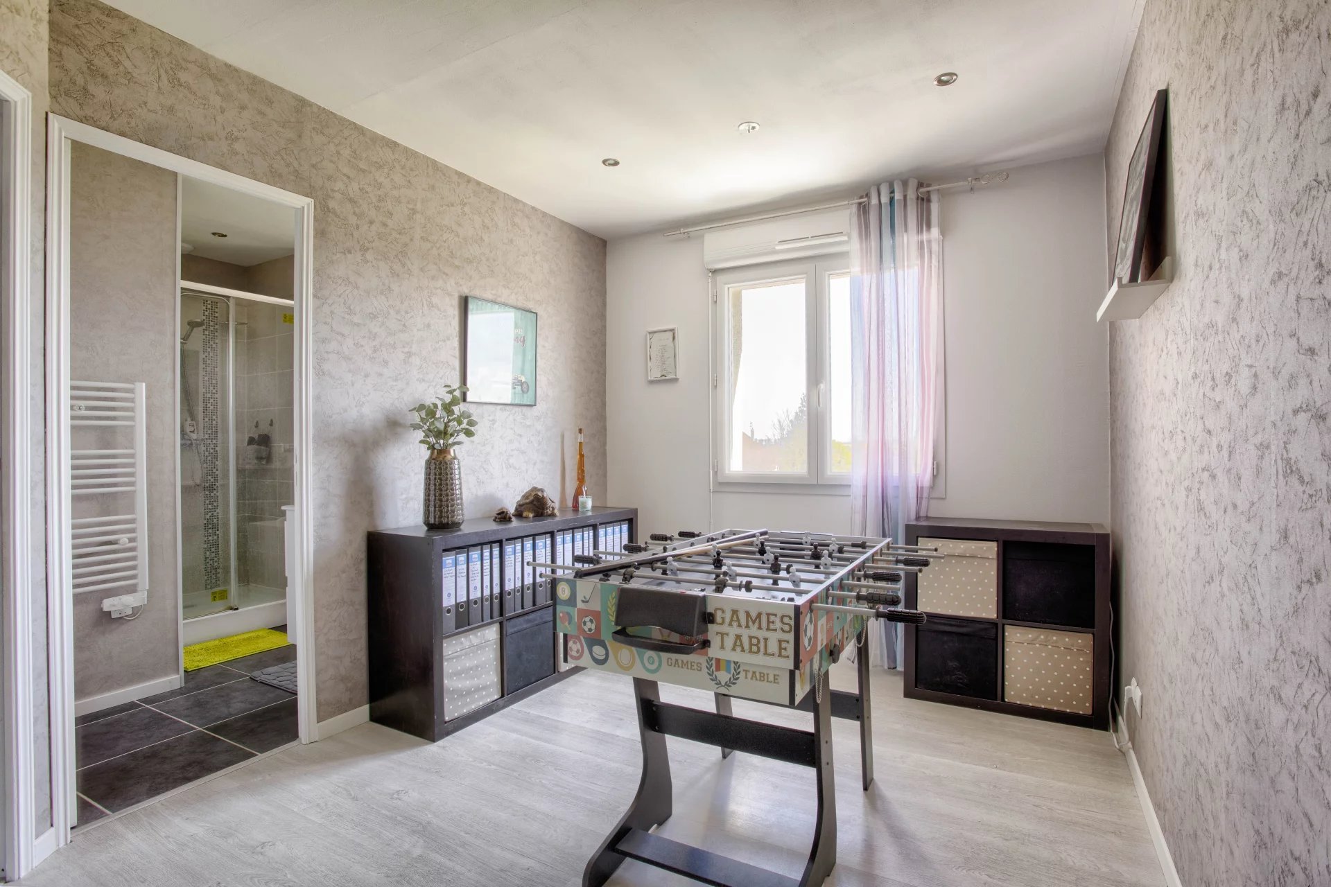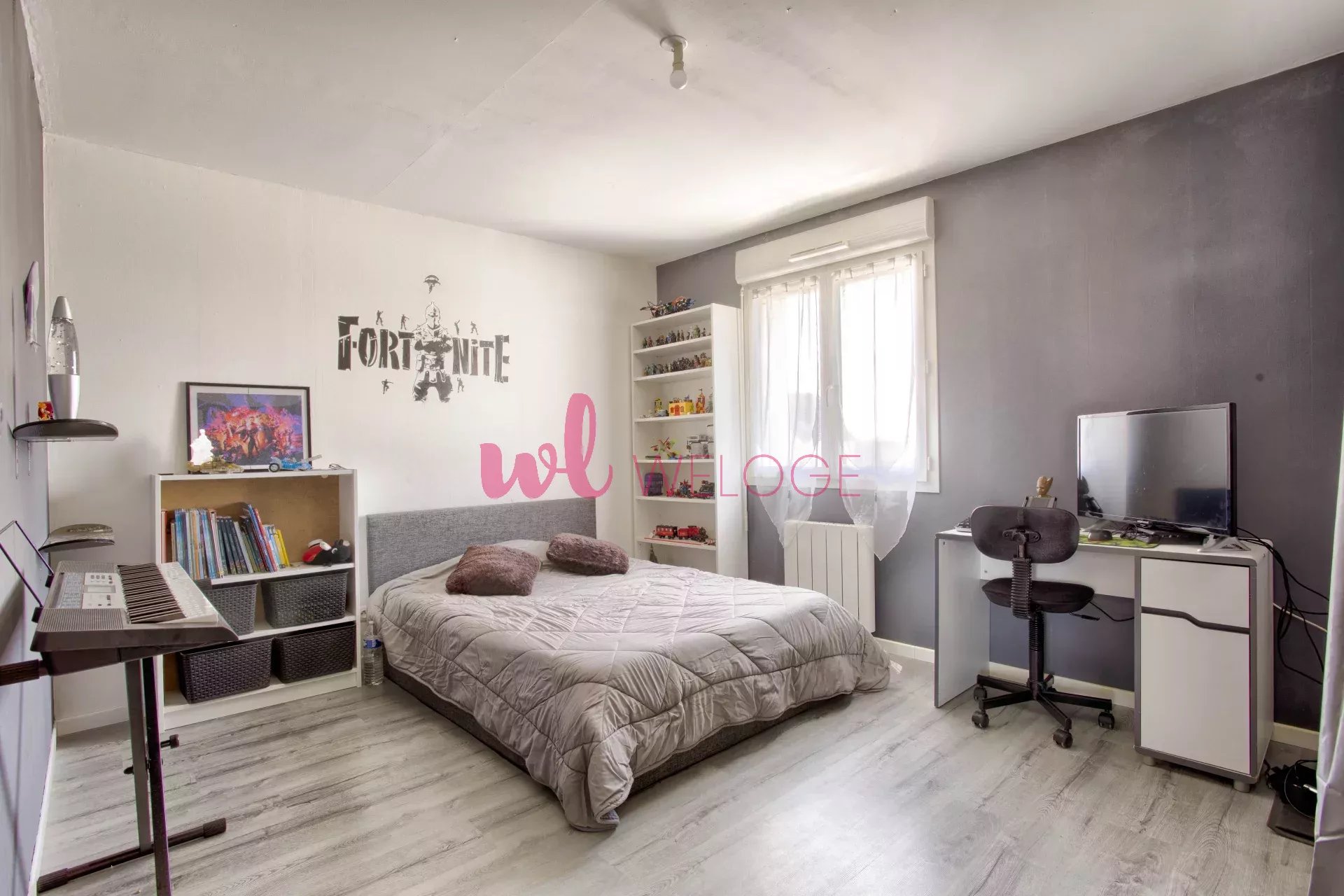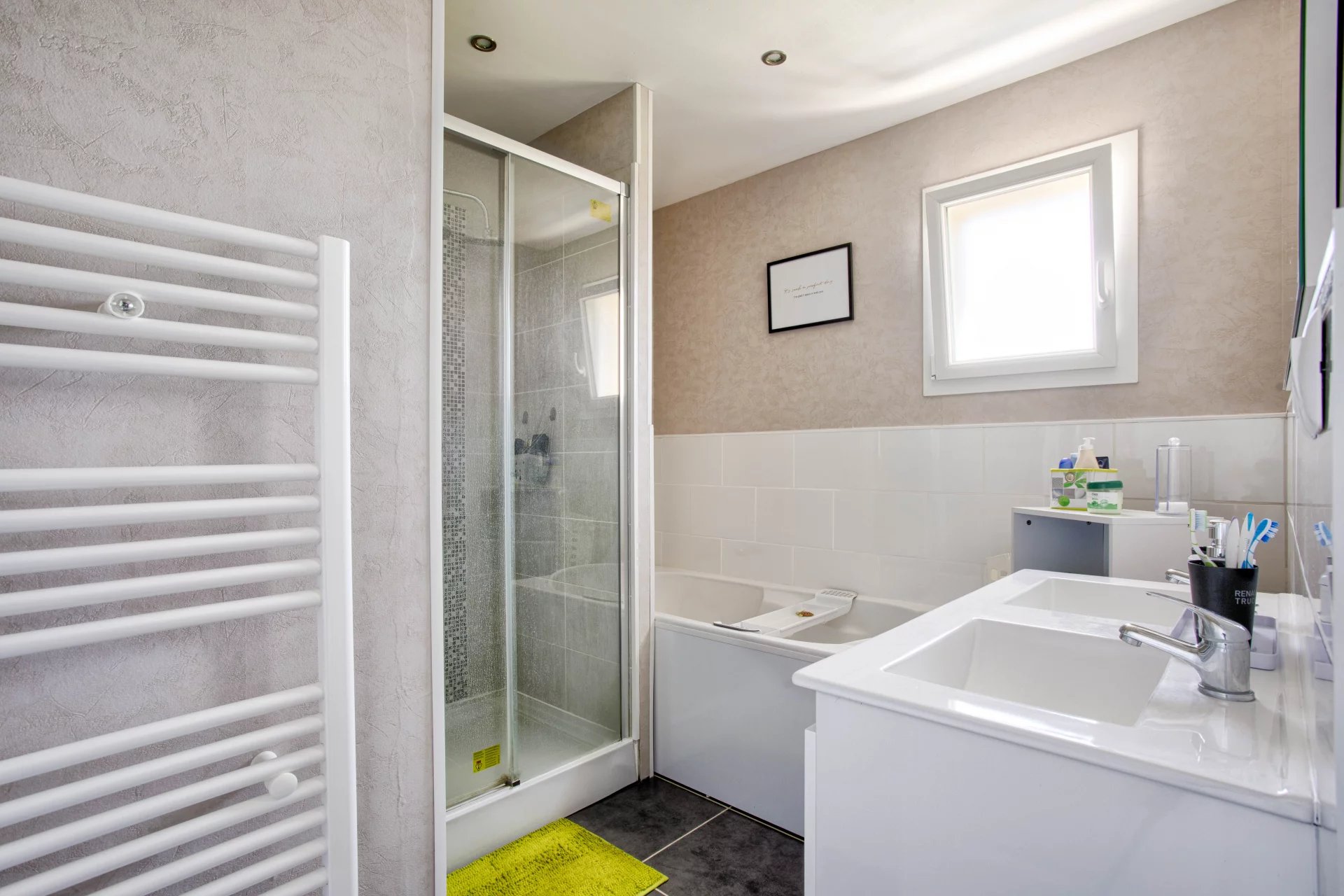 A l’étage : Un vaste Hall de 9m2 donnant accès à 3 belles chambres de 12m², 13m² et 14m² et une salle de bain avec toilettes (baignoire, douche et une double vasque).