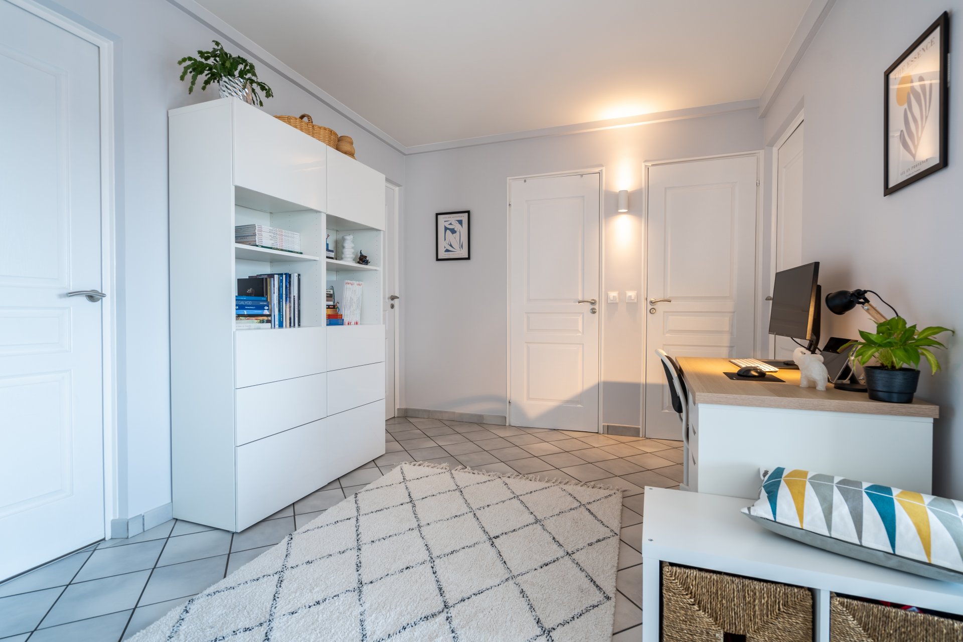 L’entrée aménagée d’un grand placard mural accueille actuellement un coin bureau, idéal pour le télétravail.