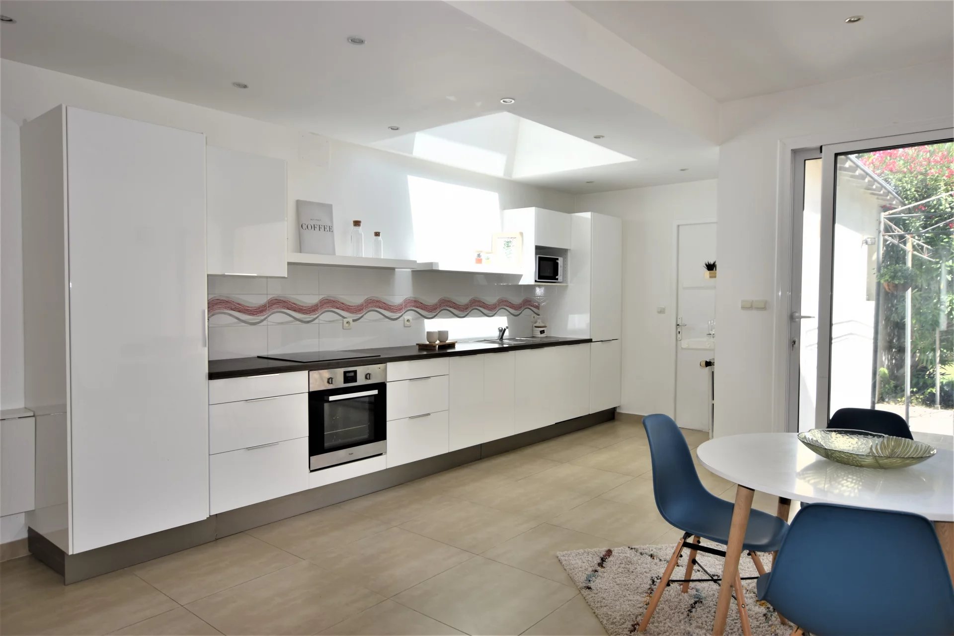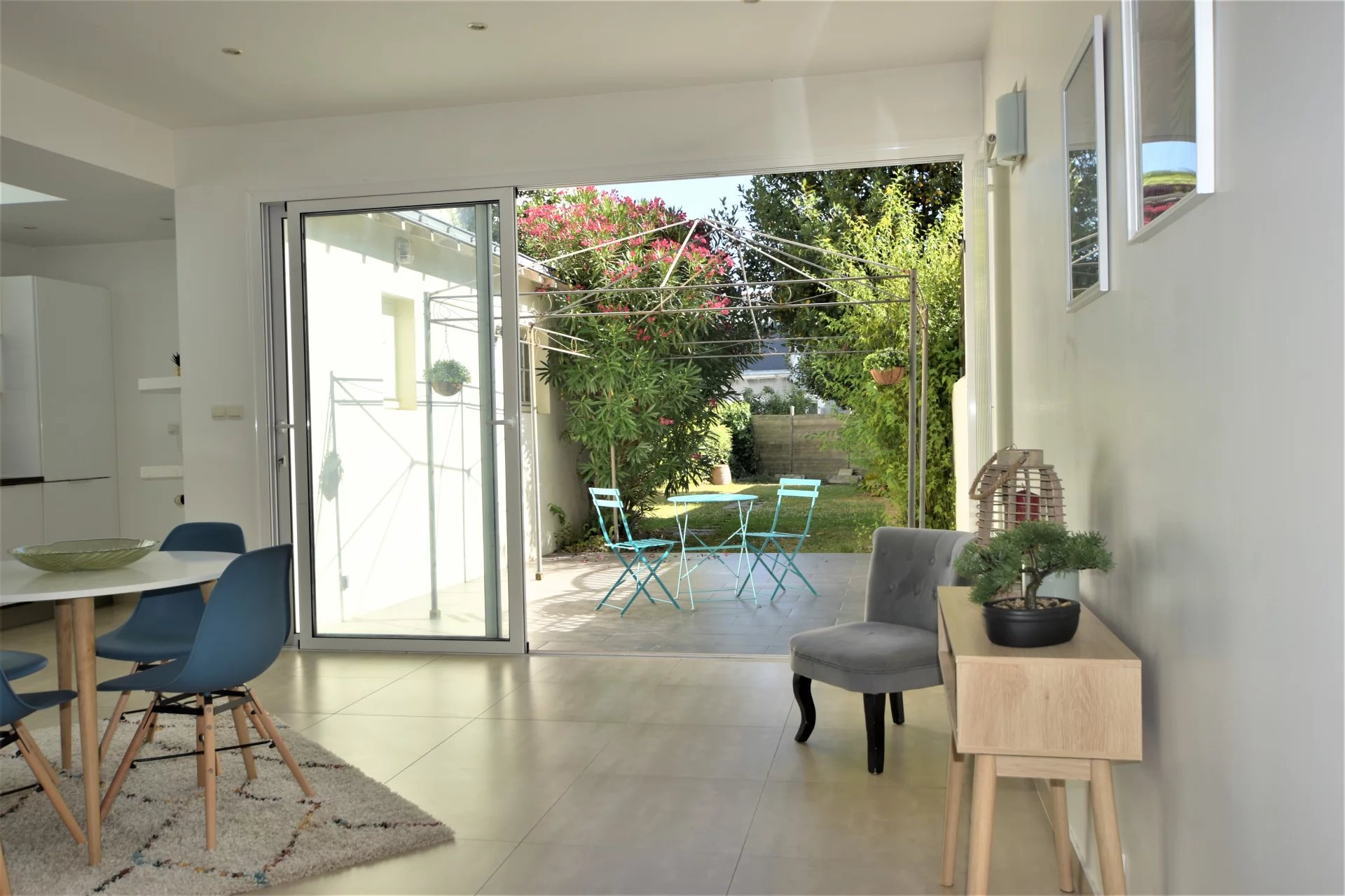 – une très belle pièce de vie de 31,28 m2 (possibilité de faire une chambre en rez-de-chaussée) desservant une belle cuisine équipée et aménagée de 34,11 m2, avec sa baie vitrée donnant sur une terrasse de 18,91 m2 et un joli jardin fleuri.