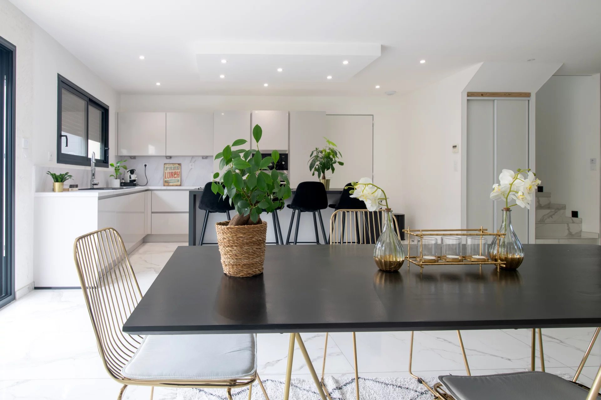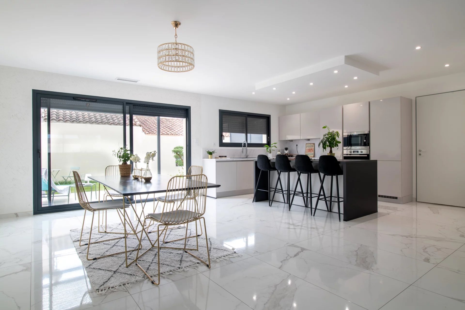 Au rez-de-chaussée, la maison se compose d’une entrée donnant sur une grande pièce de vie baignée de lumière de 38m2 ouvrant sur la terrasse au sud.