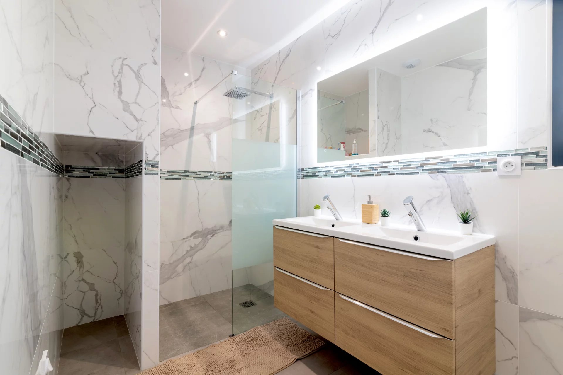 À l’étage, 3 grandes chambres avec placard, une belle salle de bain avec meuble double vasque, douche à l’italienne et toilettes séparés.