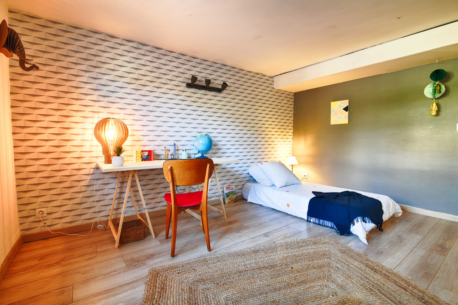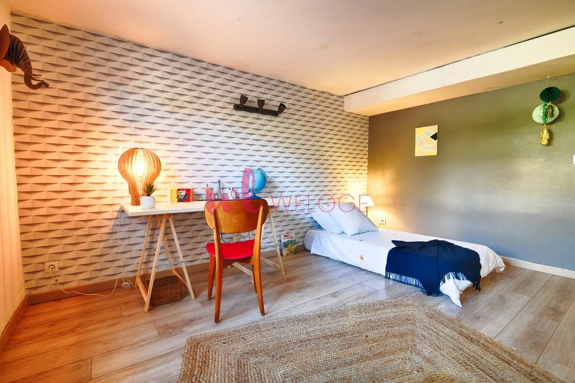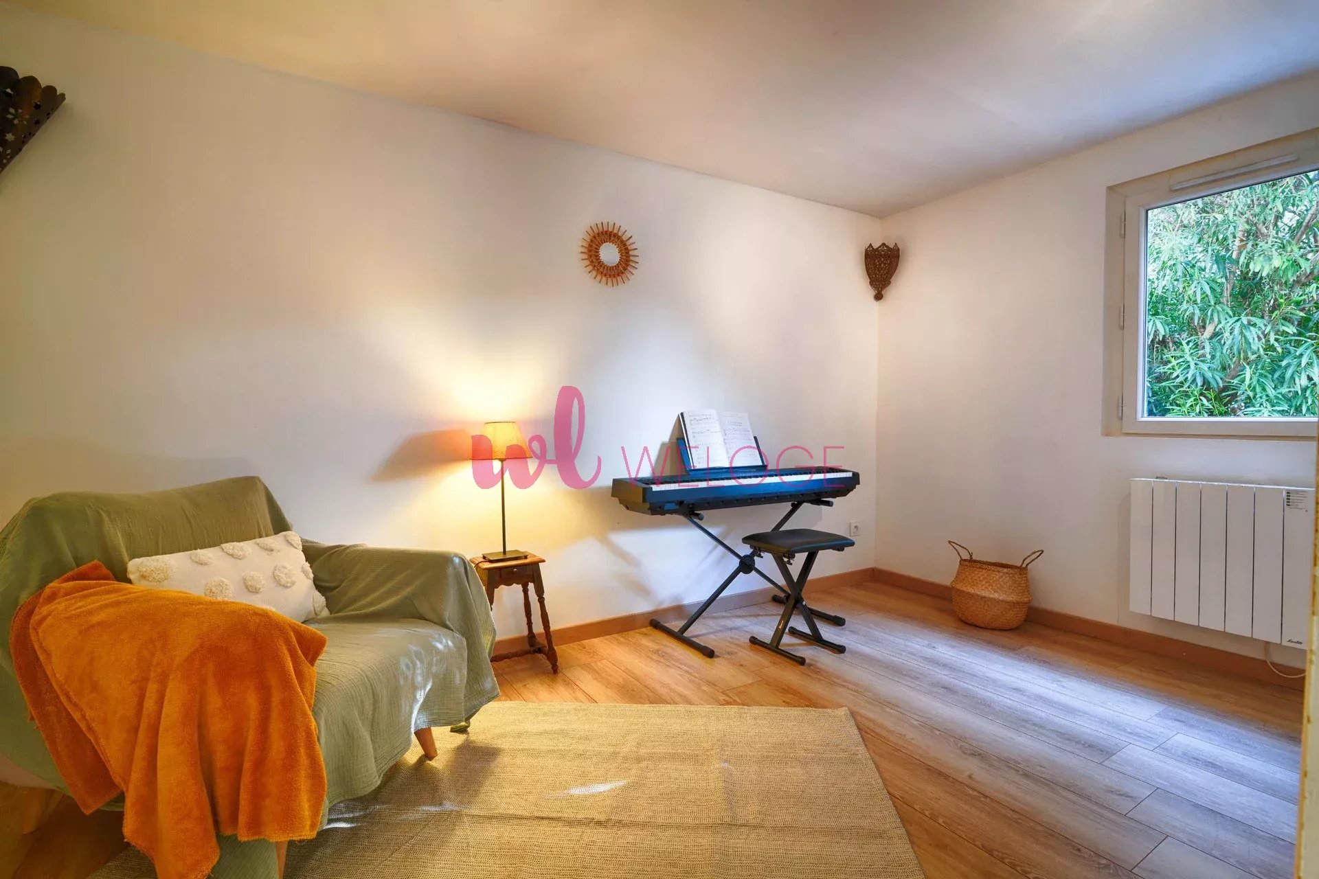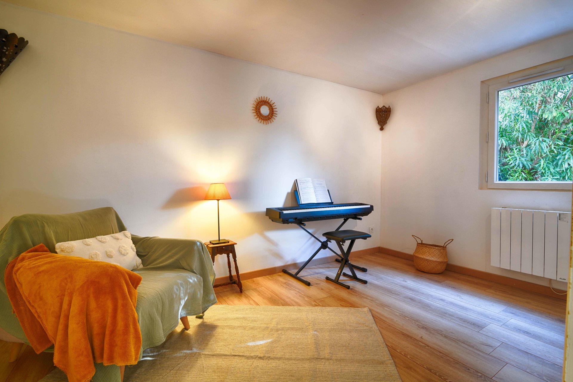 A l’étage, agréables pièces de vie avec grande cuisine équipée, double séjour lumineux orienté sud, suite parentale.