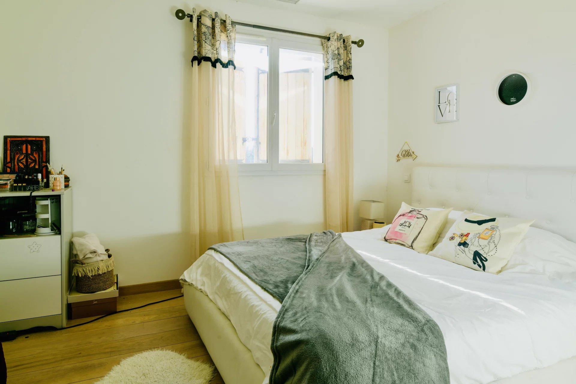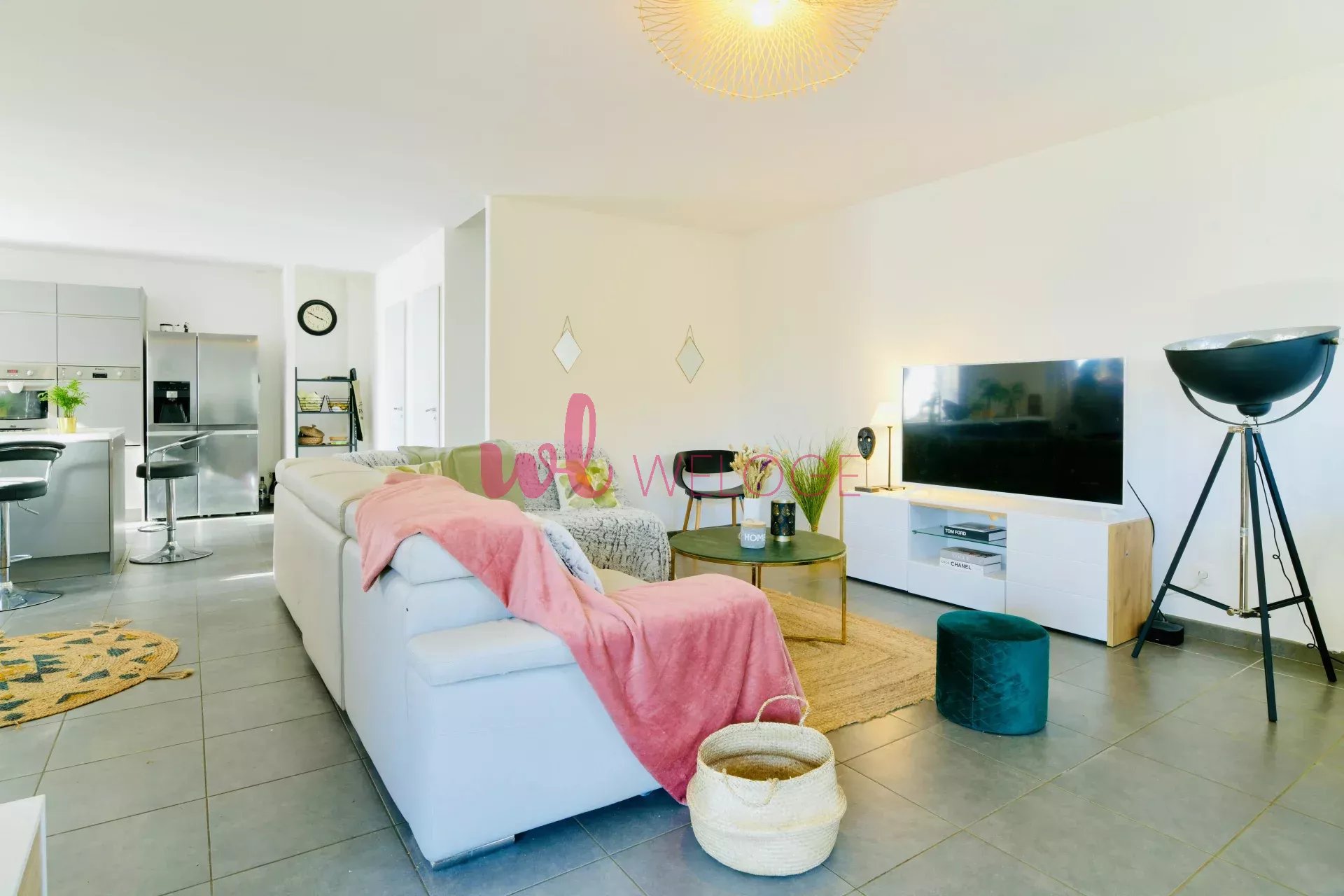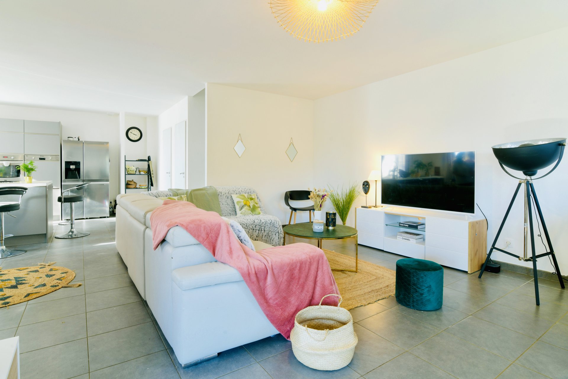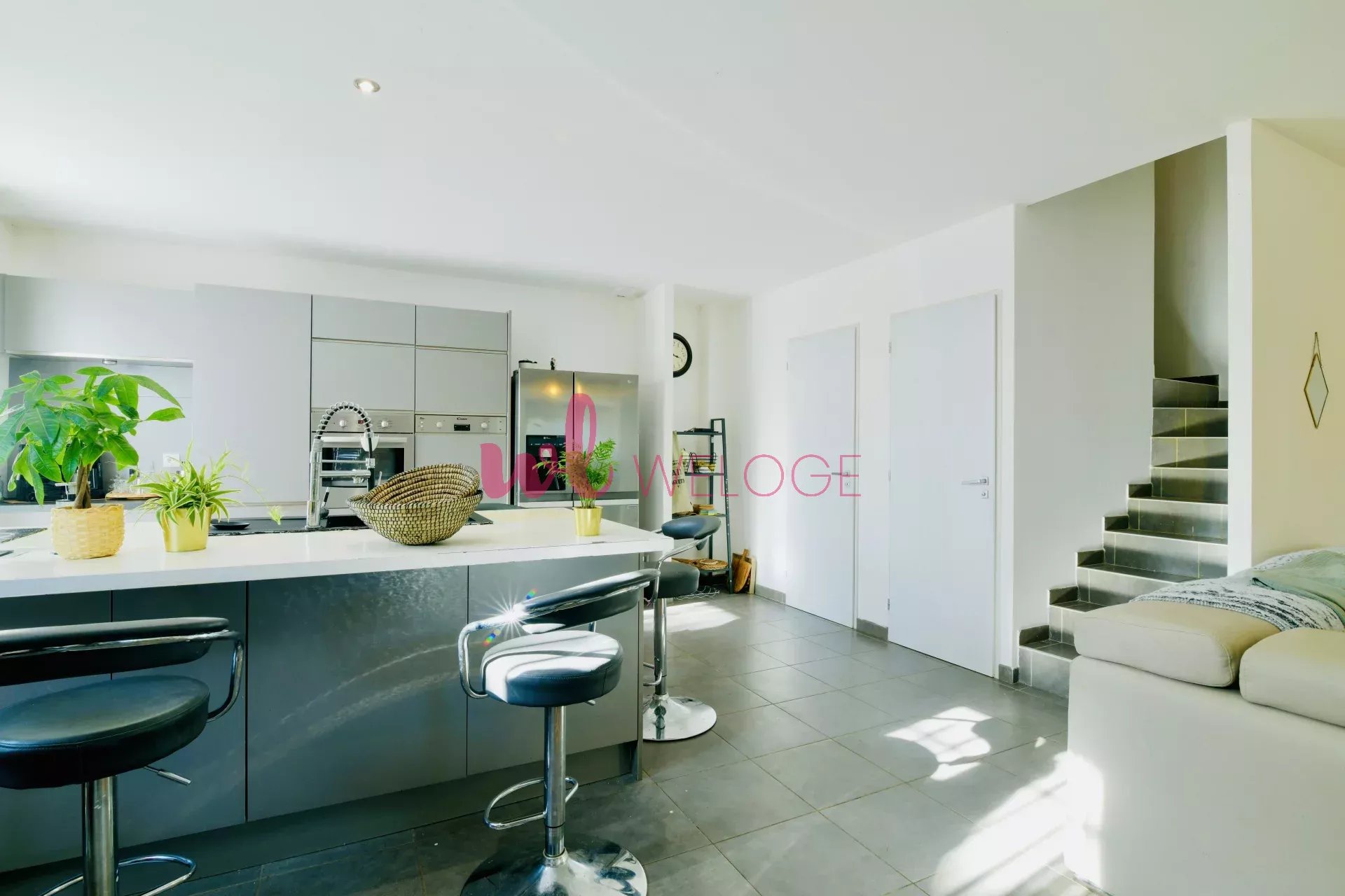 D’une surface totale de 102 m2 habitables sur une parcelle de 369 m2, la maison est composée, au rez-de-chaussée, d’une cuisine équipée, d’une buanderie, d’un WC, et d’un vaste séjour avec salon ouvrant sur la terrasse et le jardin.