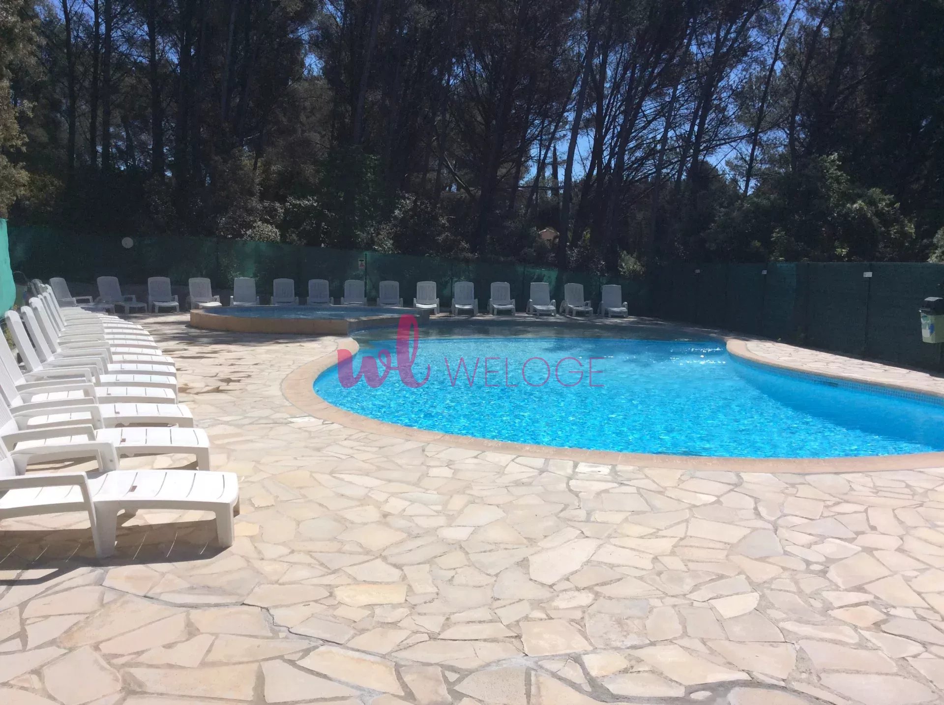 Les charges de 150€/mois comprennent l’eau, l’électricité, l’entretien des parties communes, l’entretien de la piscine et le jardinage.