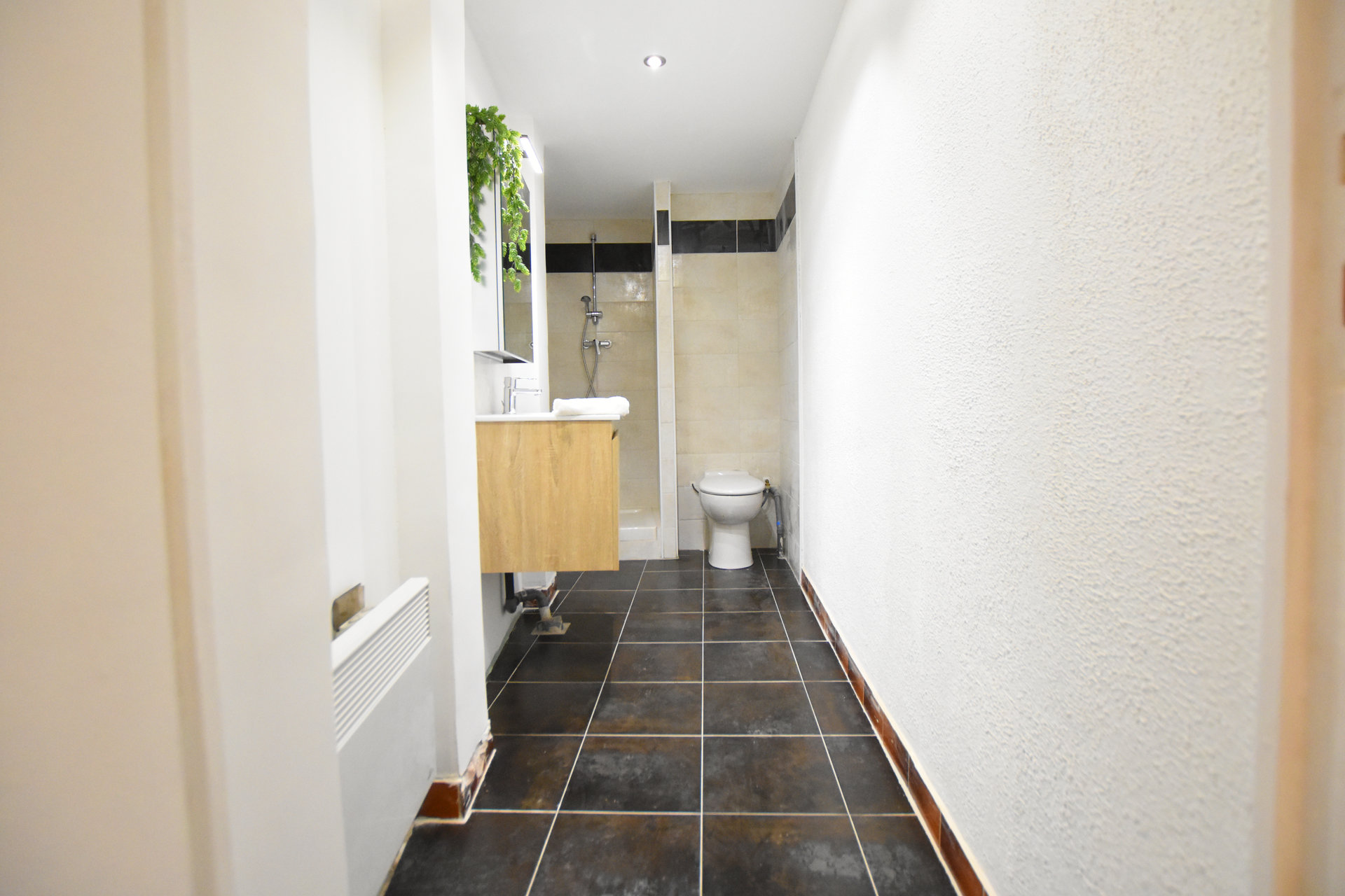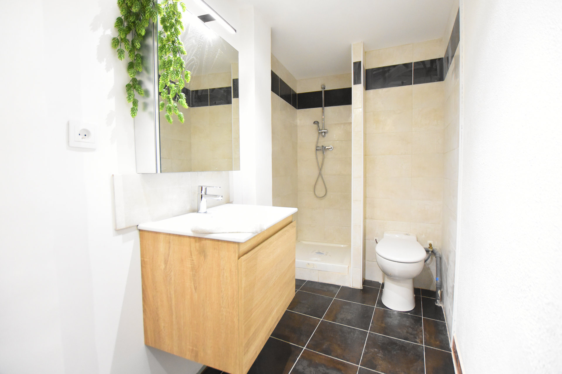 Il se compose d’un séjour cuisine équipée, d’une chambre et d’une salle de douche avec toilettes, le tout donnant sur une cour partagée exposée Nord Est.