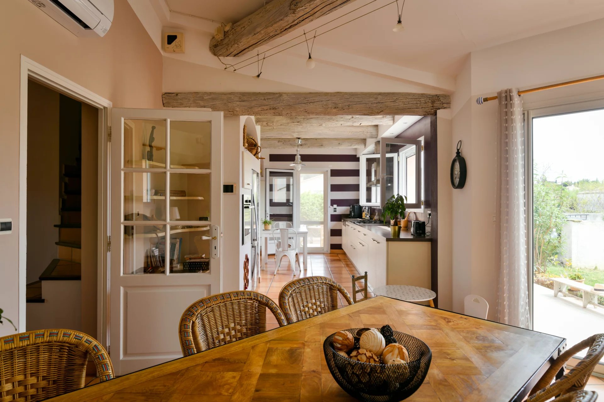 Le hall d’entrée distribue sur les espaces de vie et l’étage. On trouve immédiatement une sensation d’espace grâce aux volumes généreux des pièces et des belles hauteurs sous plafond avec poutres apparentes.