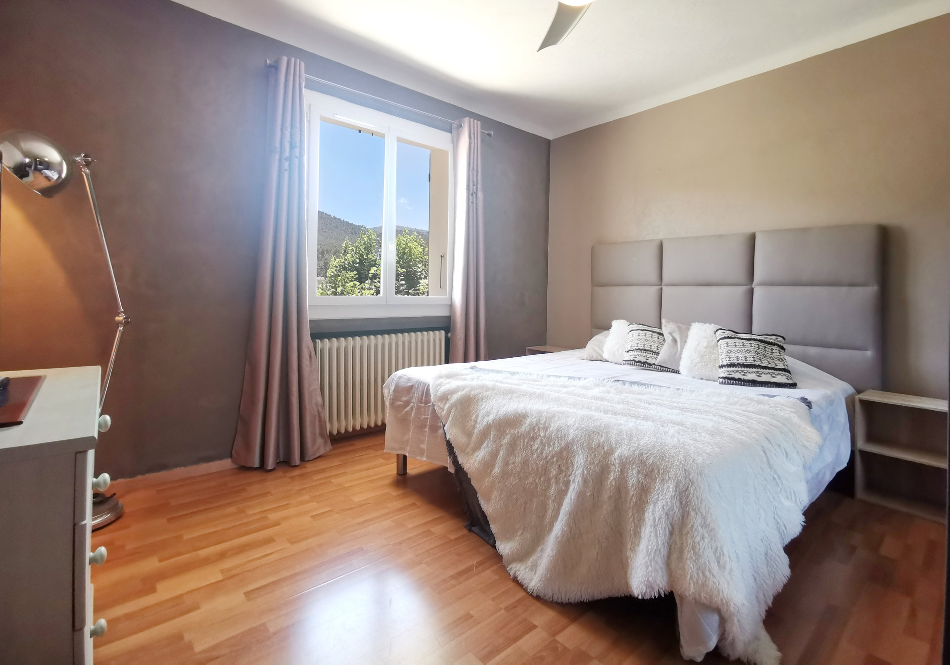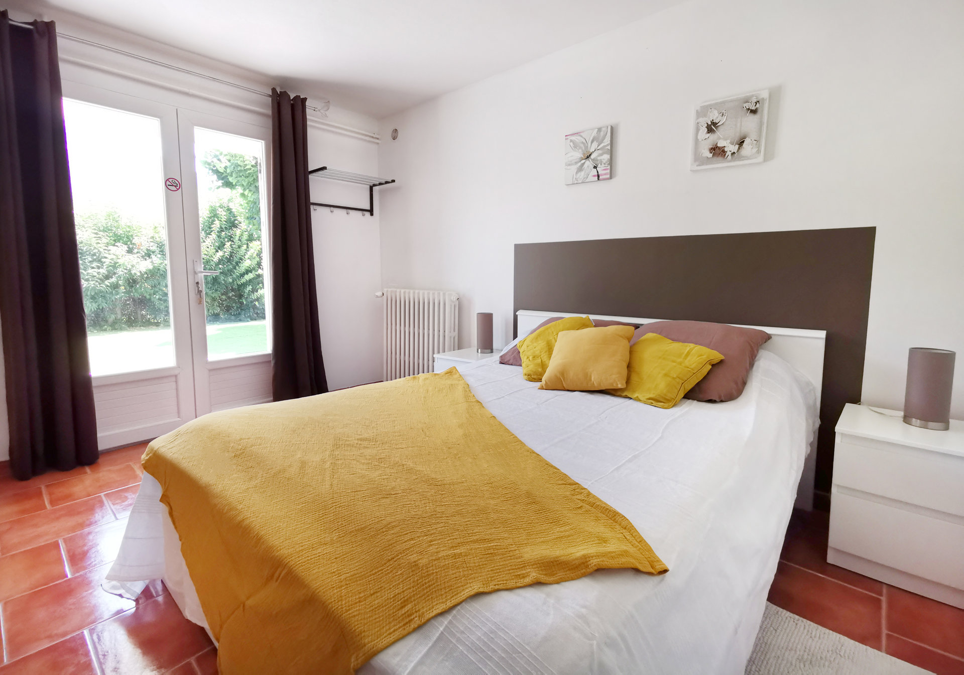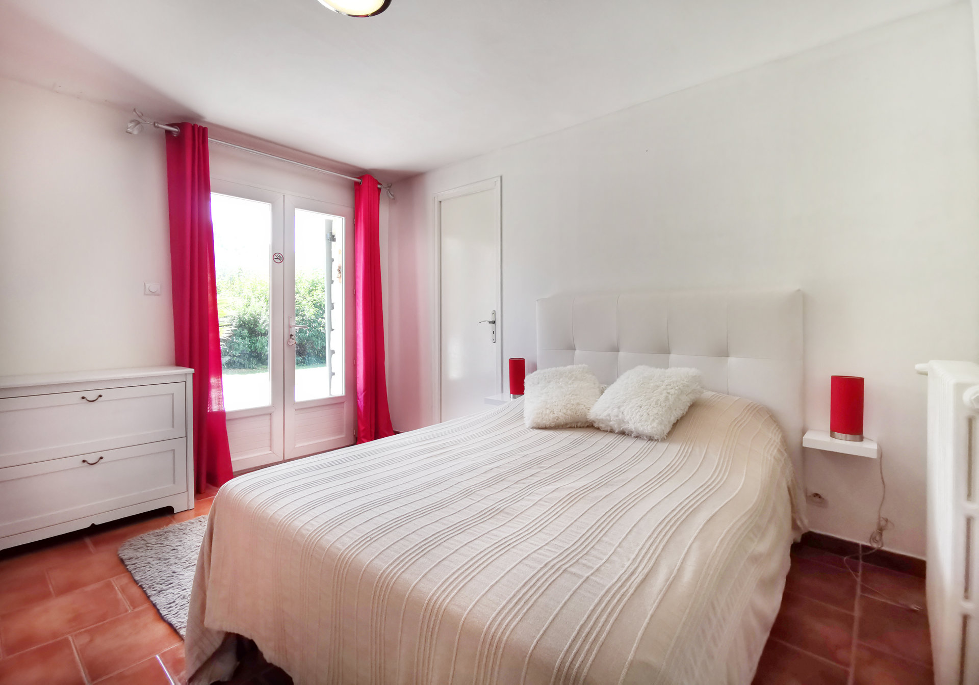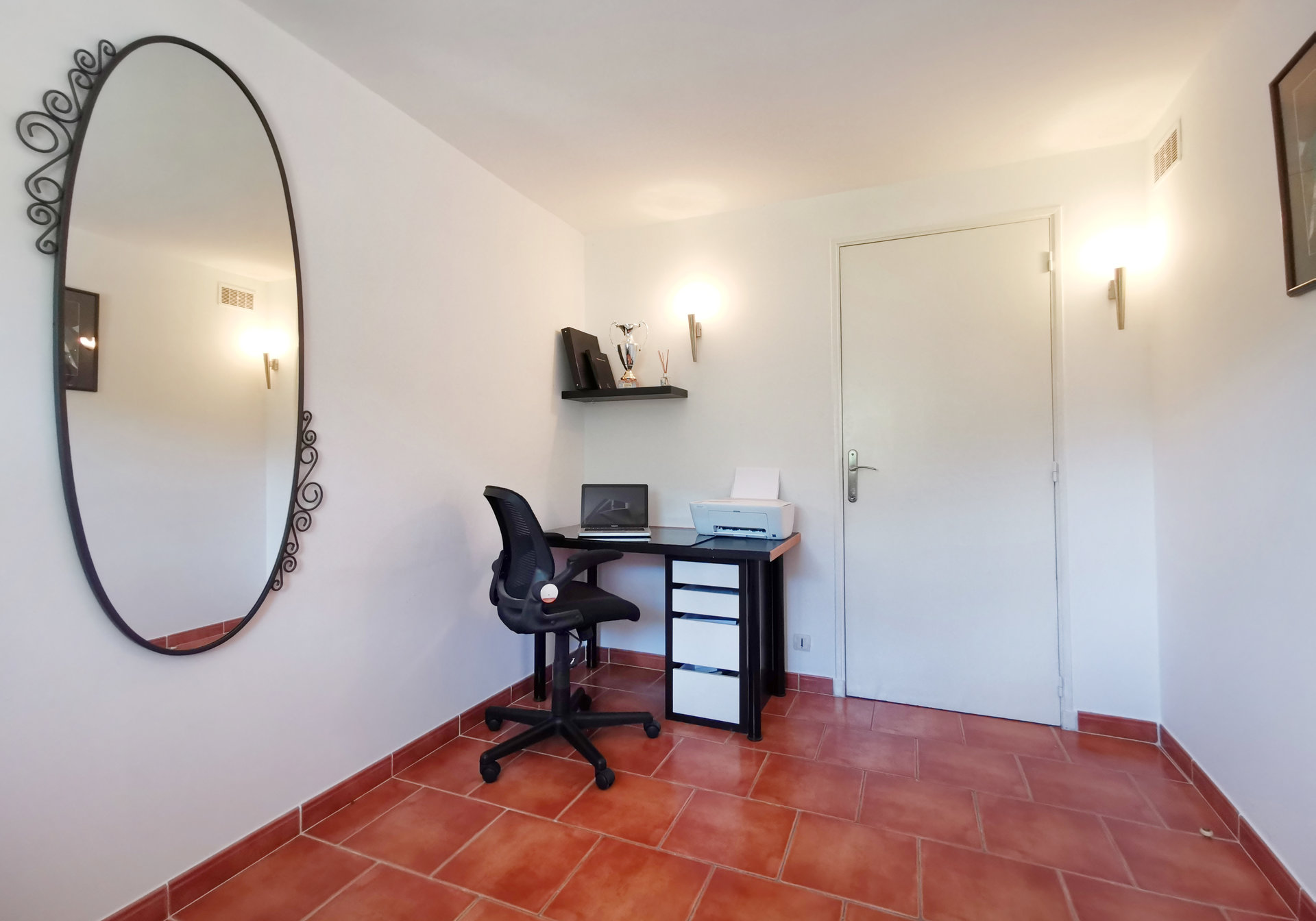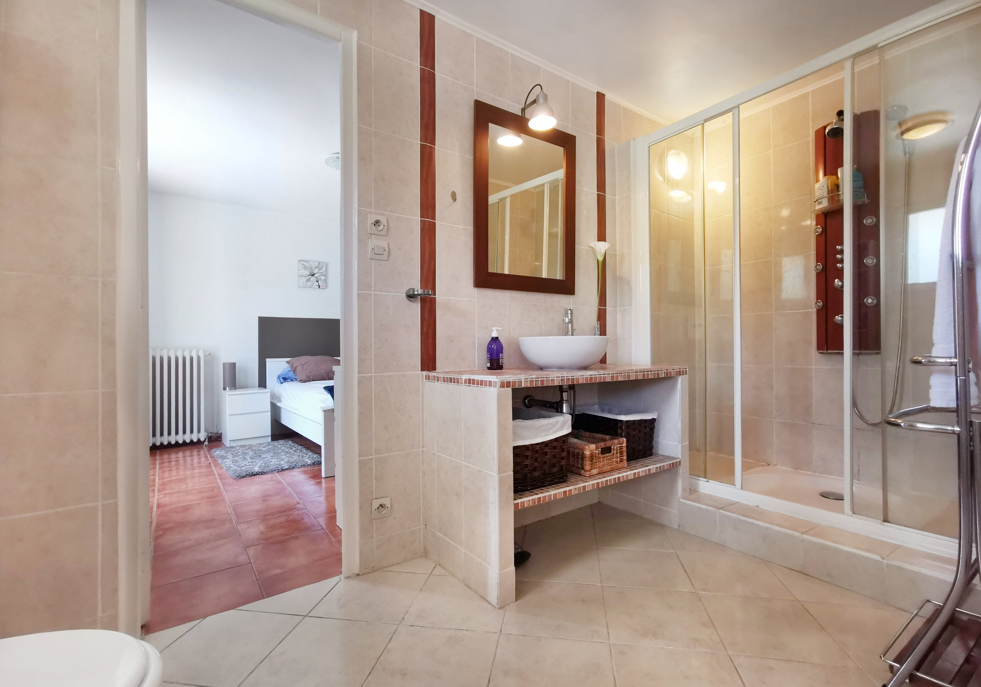 Dans la partie nuit du rez de jardin vous profiterez d’un bureau, une salle de douche avec des toilettes et deux chambres avec accès direct sur le jardin et la piscine.