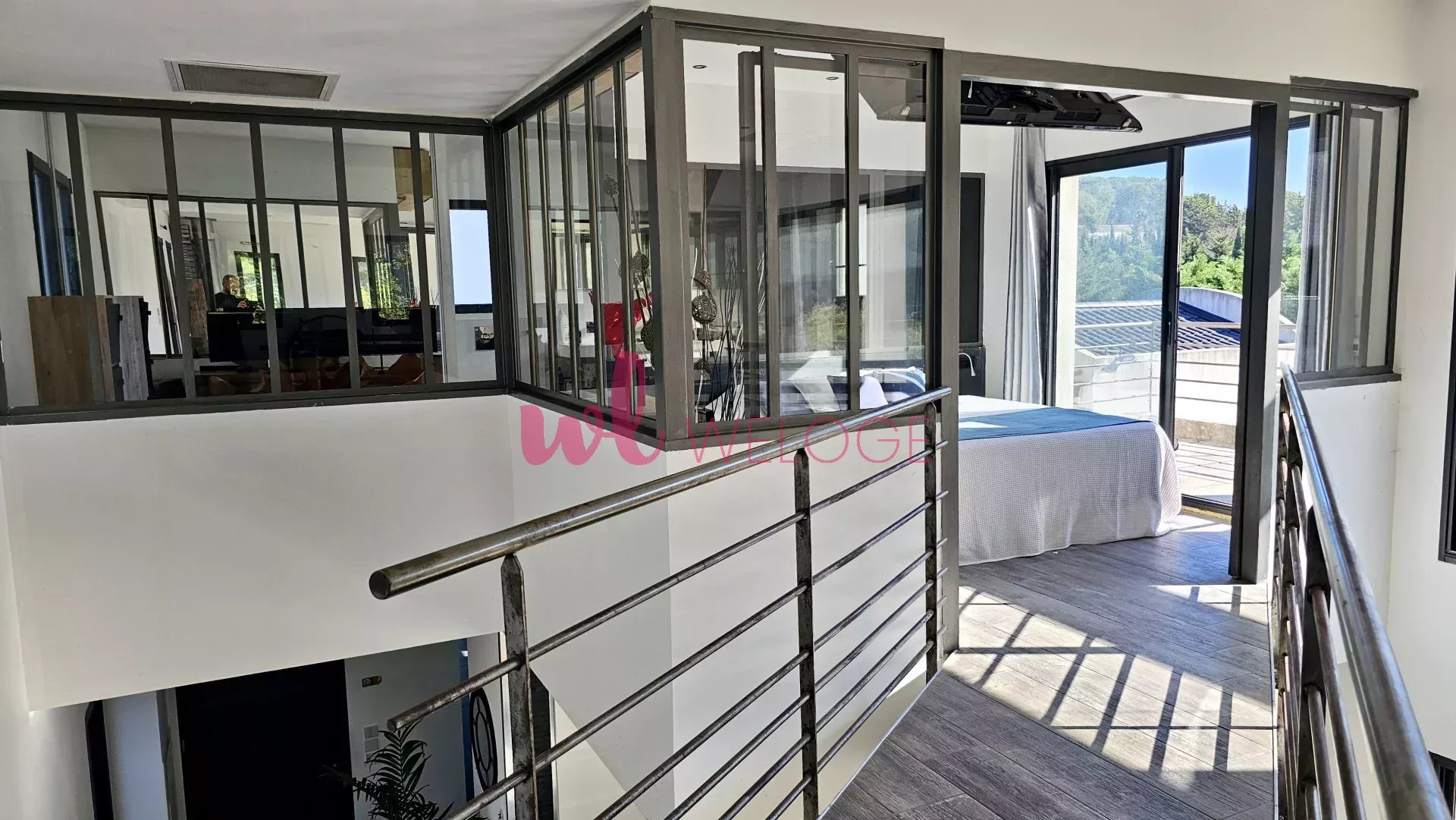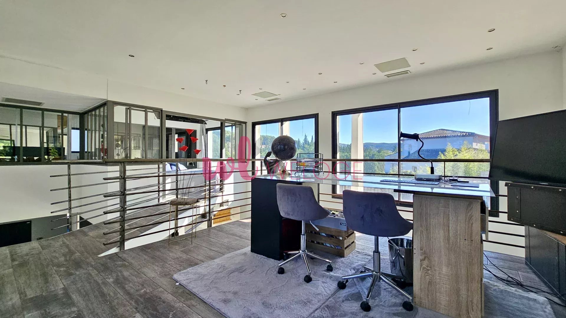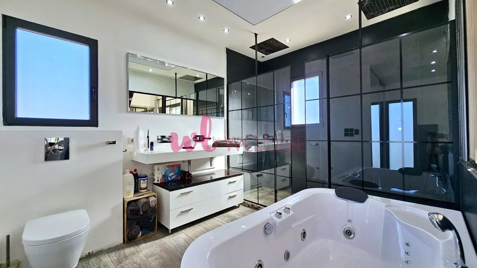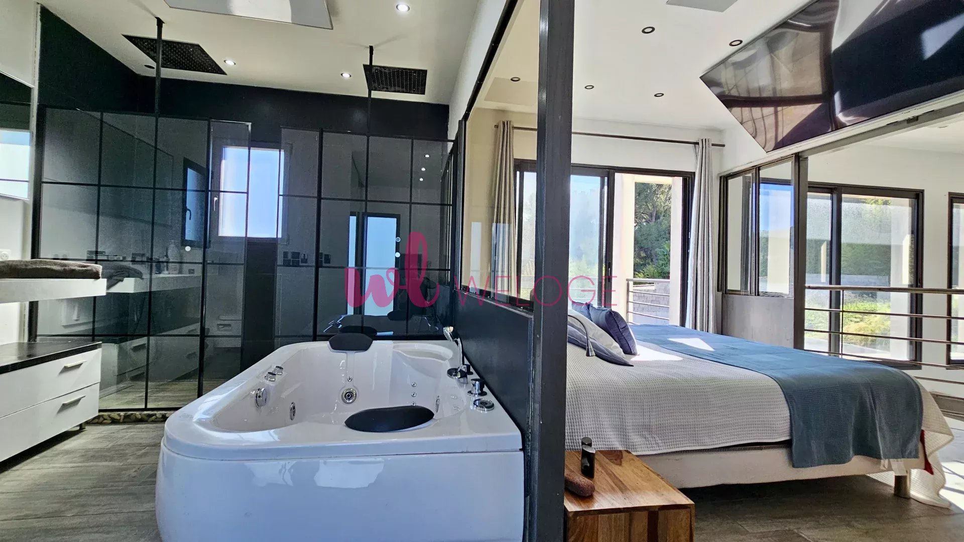 A l’étage une mezzanine faisant office de bureau de 21m2. Une passerelle vous mènera dans la suite parentale de 26,2m2, une salle de bains avec double douche et sa baignoire balnéo.