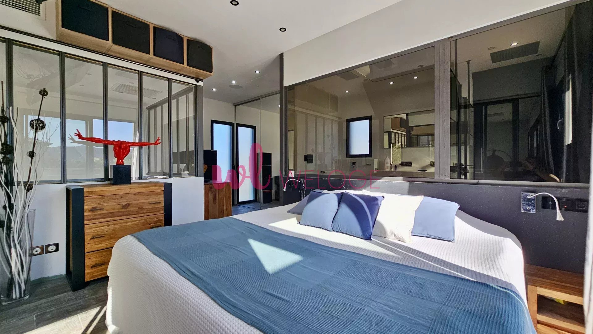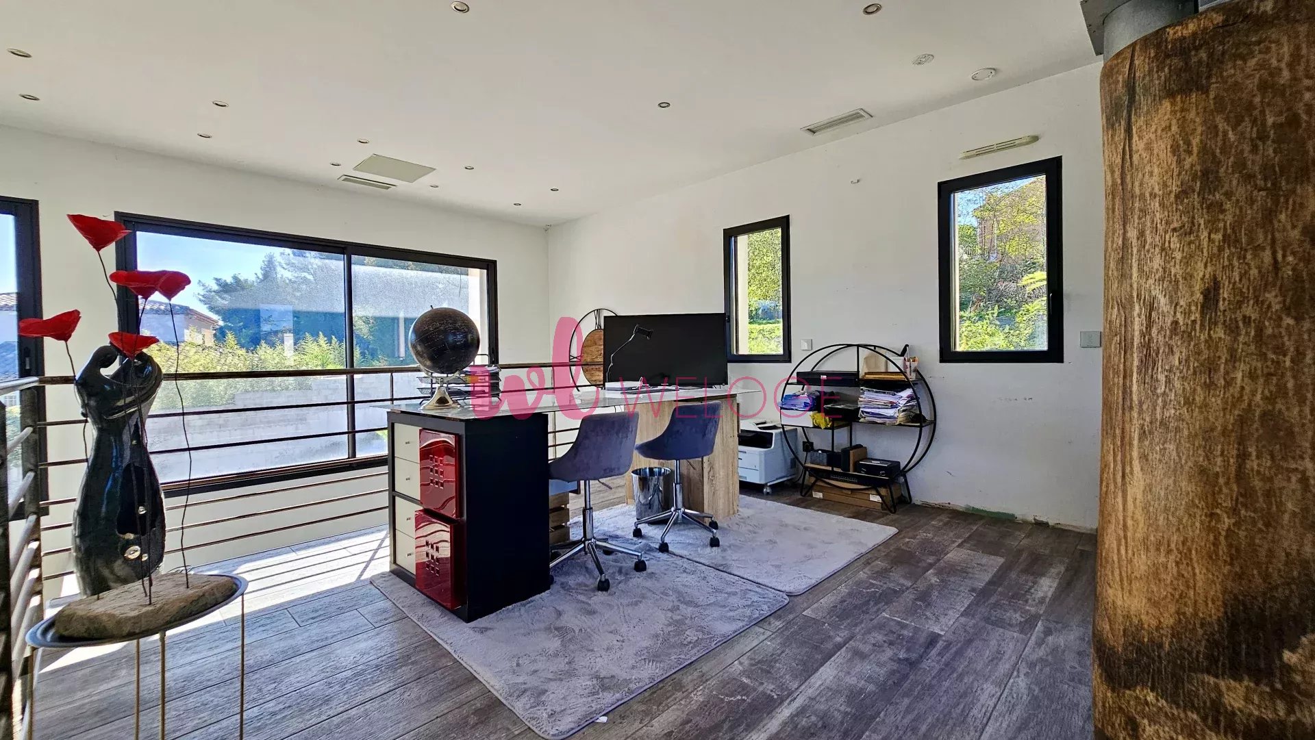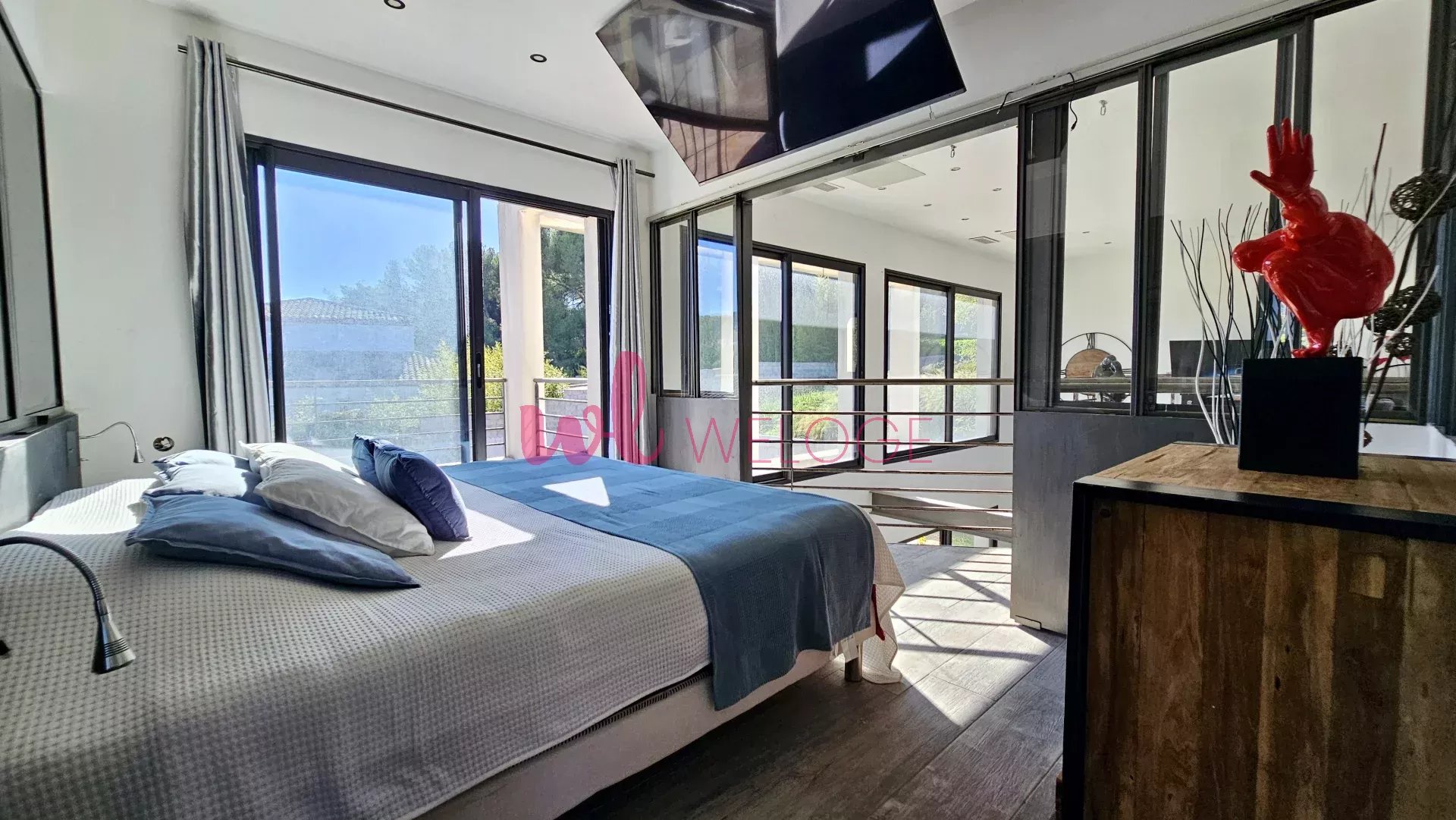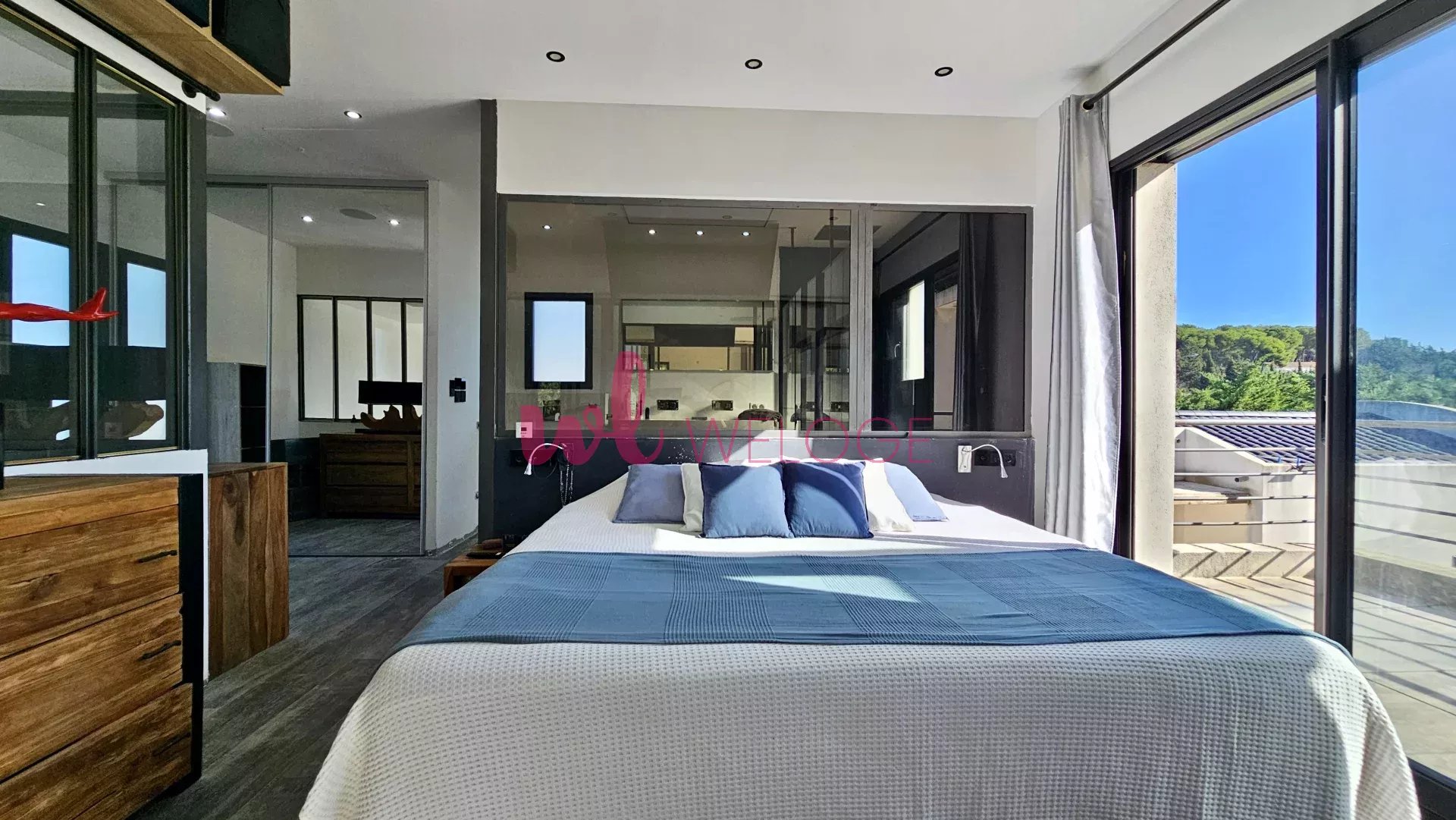 A l’étage une mezzanine faisant office de bureau de 21m2. Une passerelle vous mènera dans la suite parentale de 26,2m2, une salle de bains avec double douche et sa baignoire balnéo.