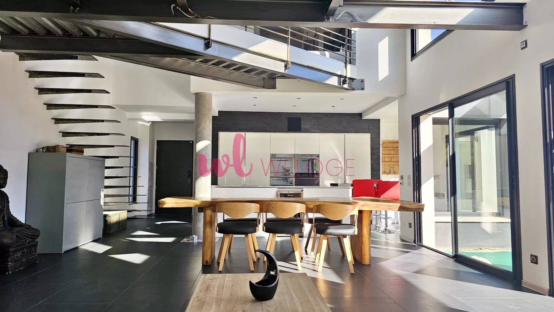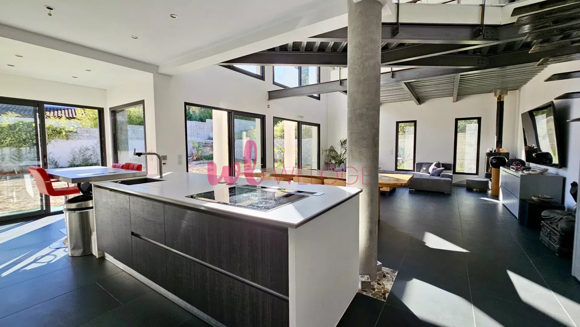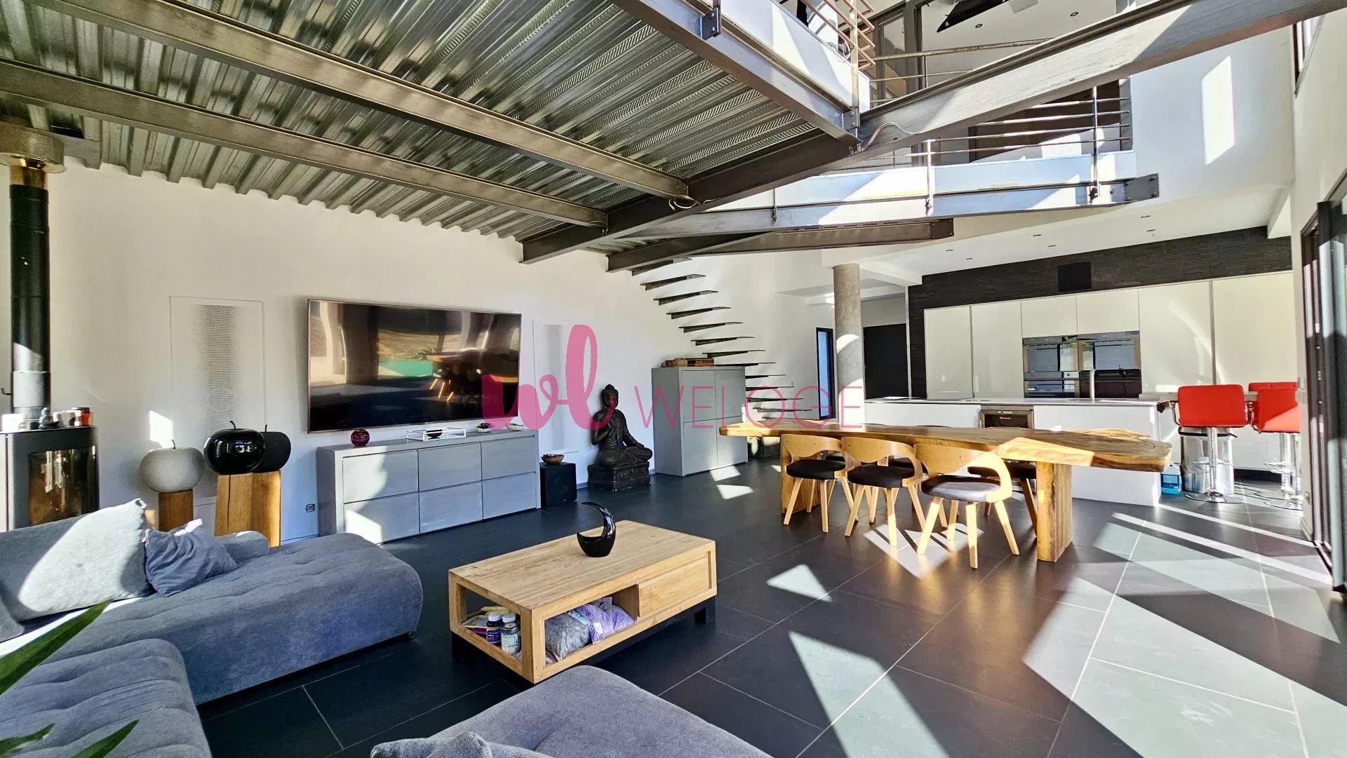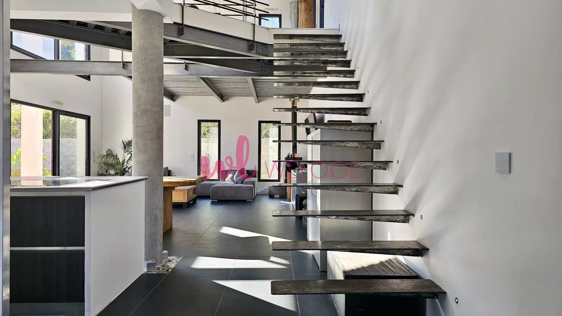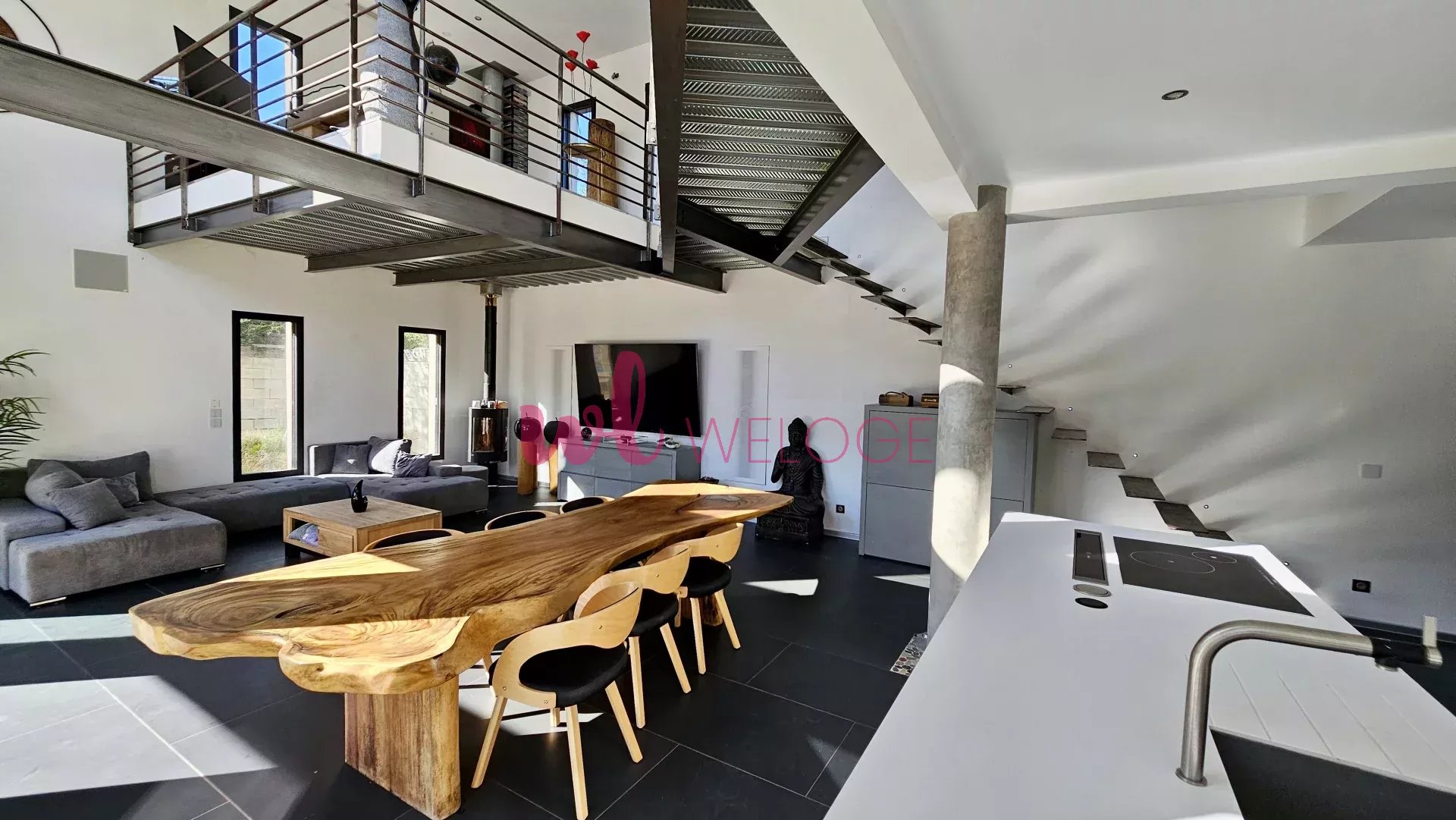 L’entrée de la villa s’effectue sur une très belle pièce de vie baignée de lumière avec sa double hauteur sous plafond et ses nombreuses baies vitrées. Vous trouverez une cuisine ouverte sur séjour avec son poêle à bois.