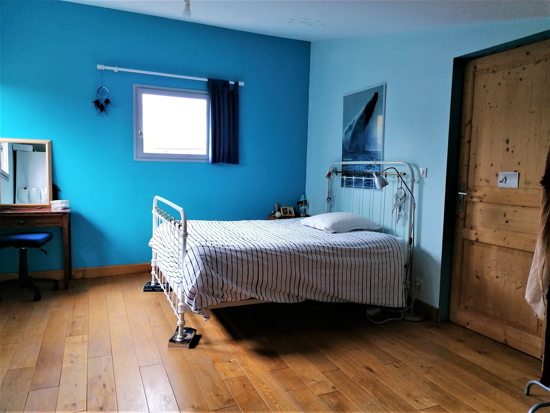 A l’étage, vous trouverez une deuxième chambre et une grande mezzanine ( exploitée en bureau mais possibilité de créer une troisième chambre ) avec un accès au toit terrasse.