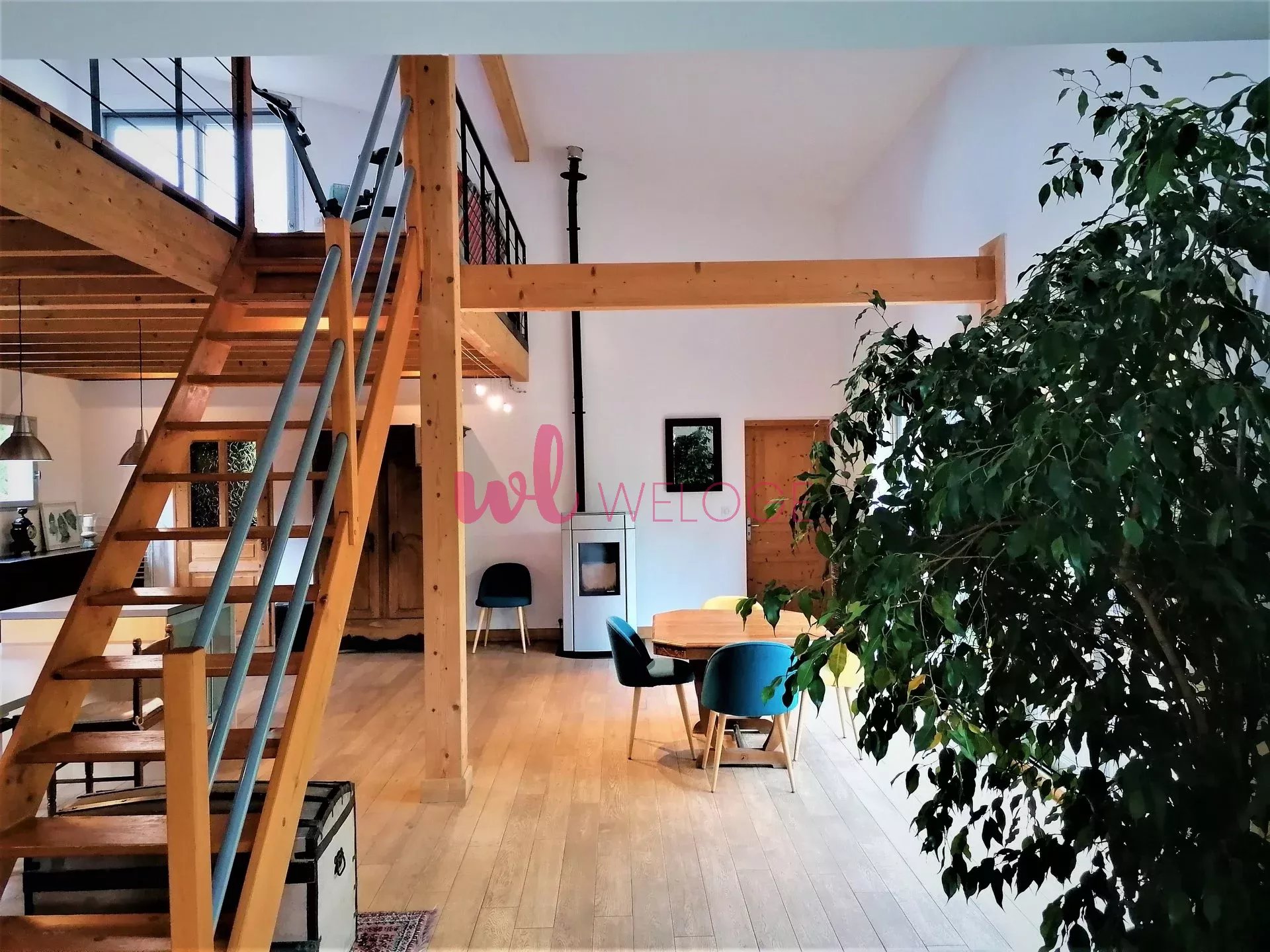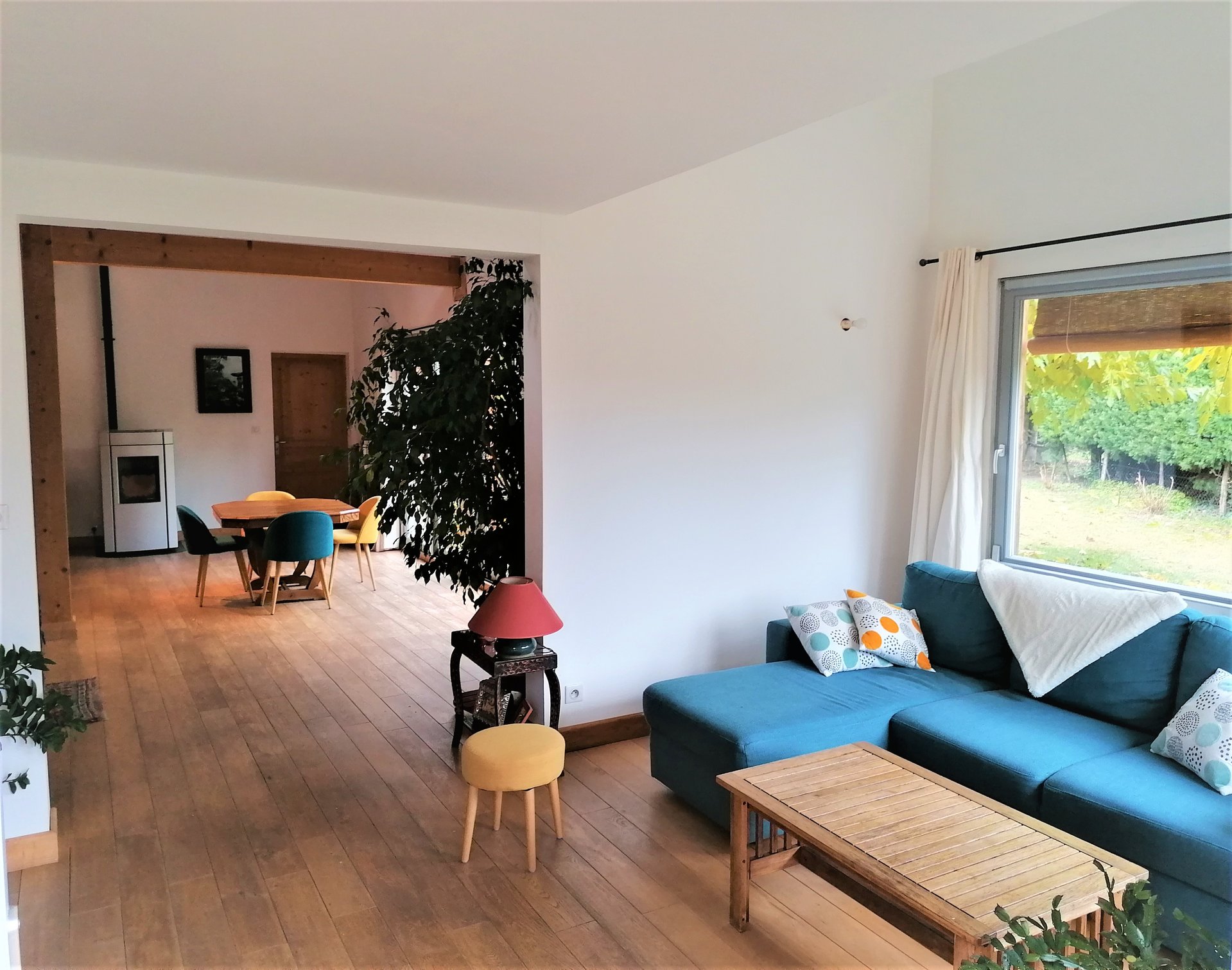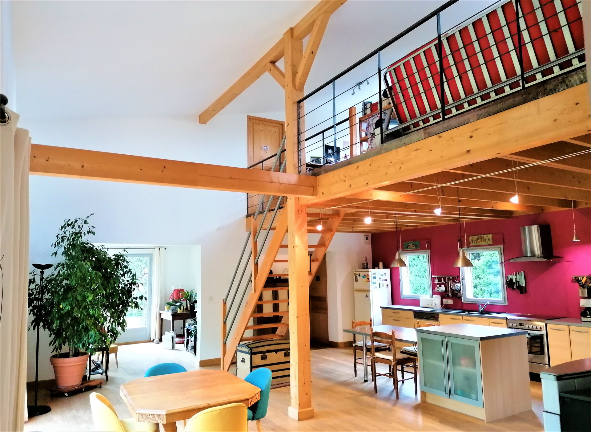 Elle se compose au rez-de-chaussée d’une très grande pièce à vivre, très lumineuse avec ses grandes baies vitrées, ouverte sur une cuisine équipée.