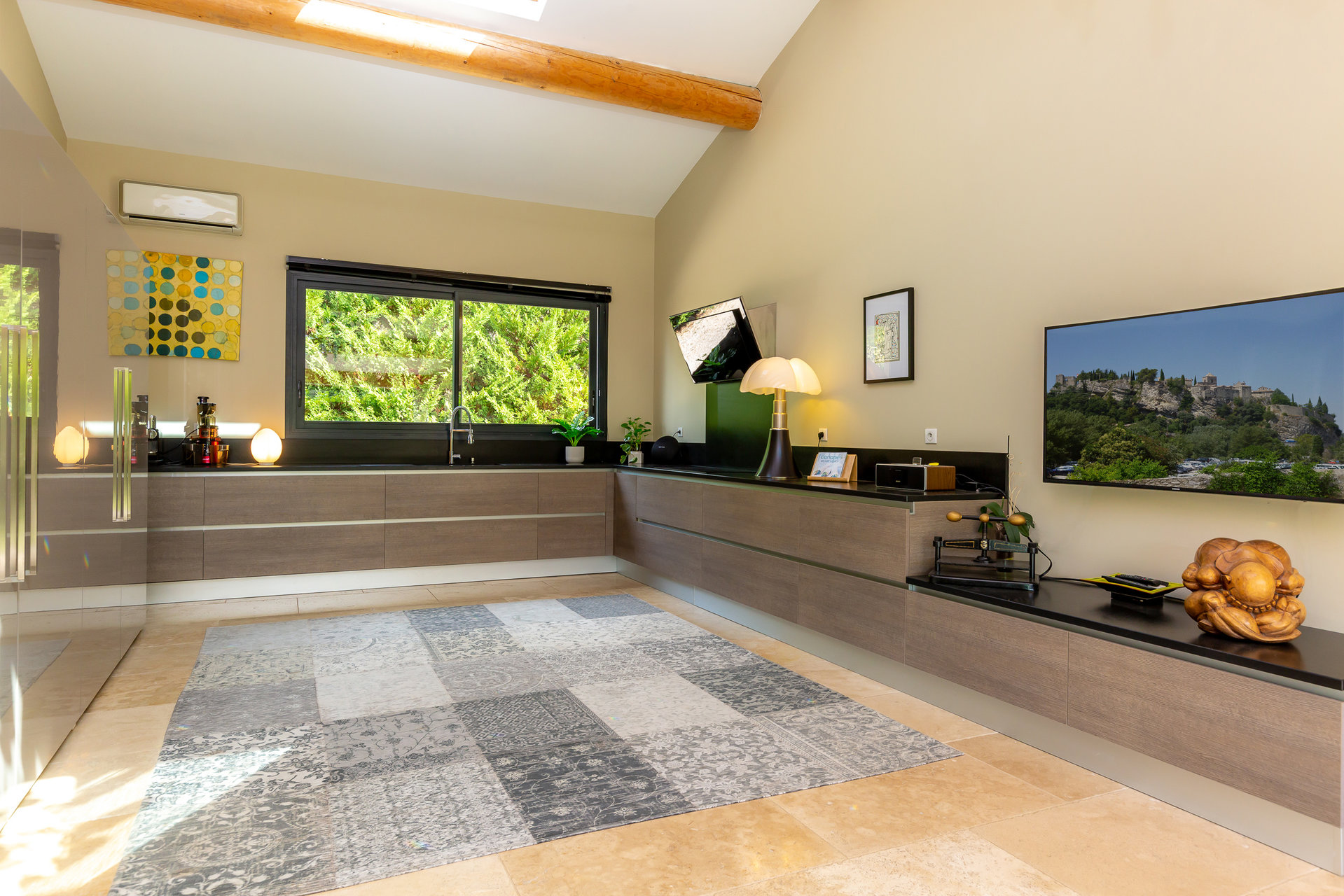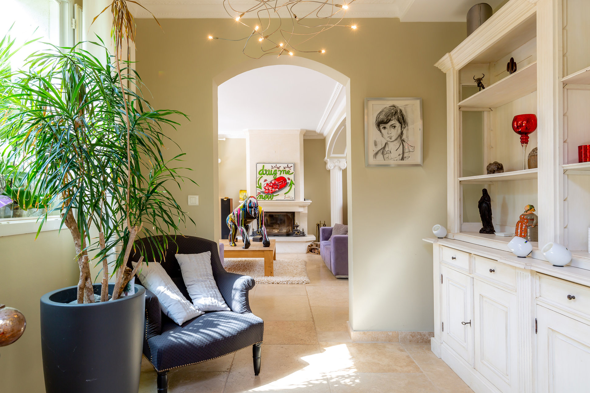 La première comprend un séjour, cuisine ouverte de 60 m2 qui s’ouvre entièrement sur le jardin grâce à ses grandes baies vitrées à galandage, une suite parentale de 40m2 avec sa terrasse, un salon cosy avec cheminée, jardin d’hiver et deux chambres avec salle de bain à l’étage. Chaque pièce ouvrant sur sa propre terrasse.