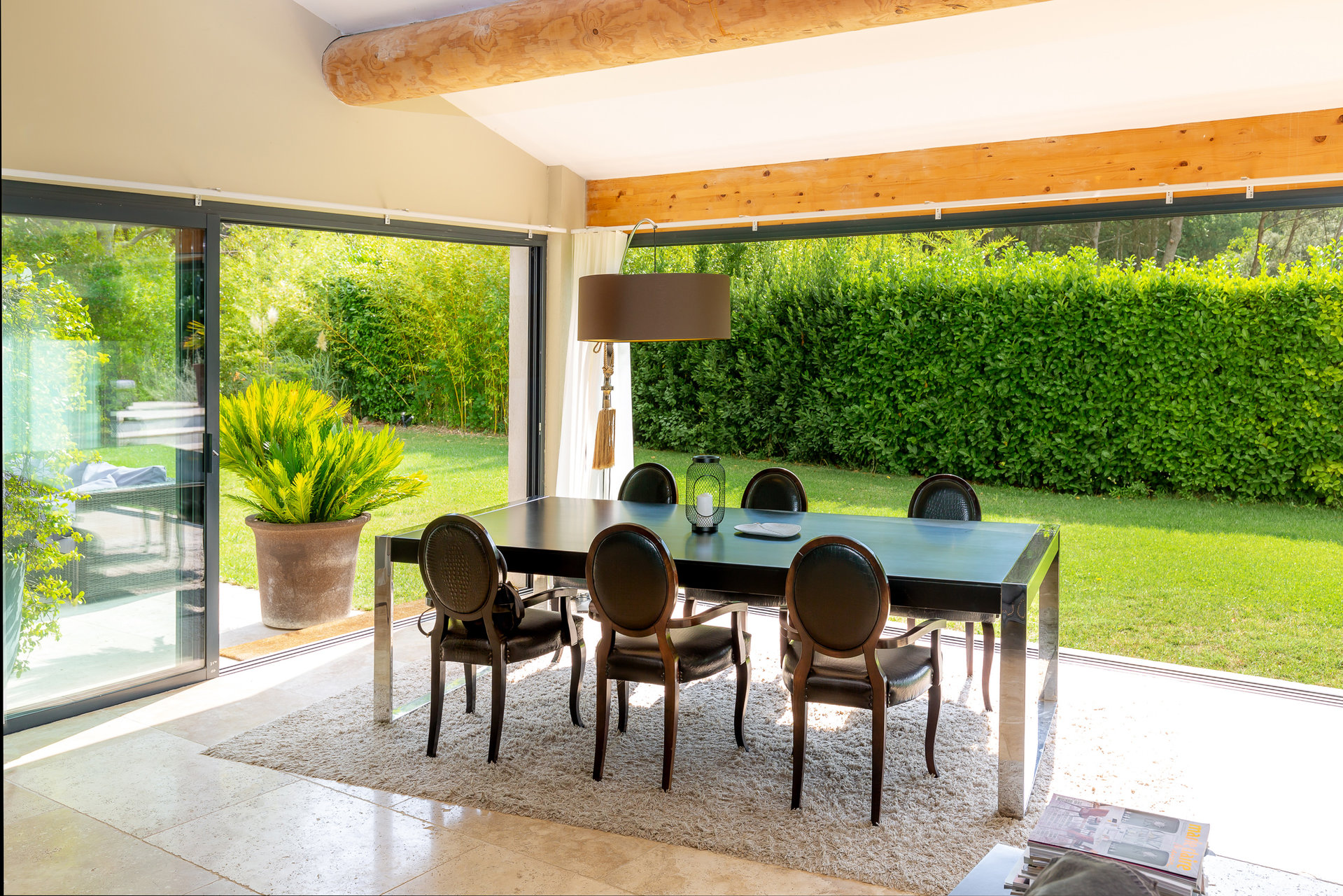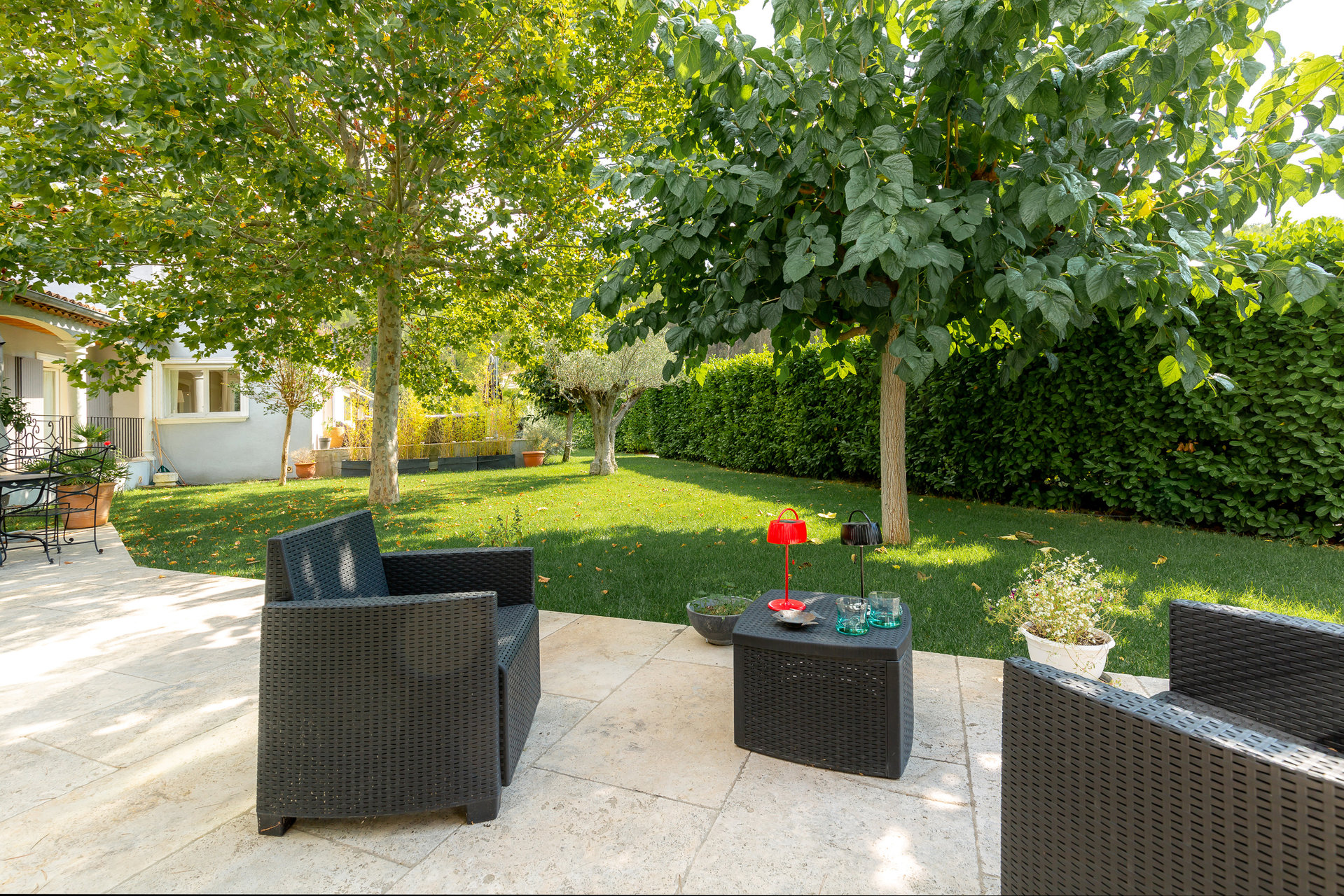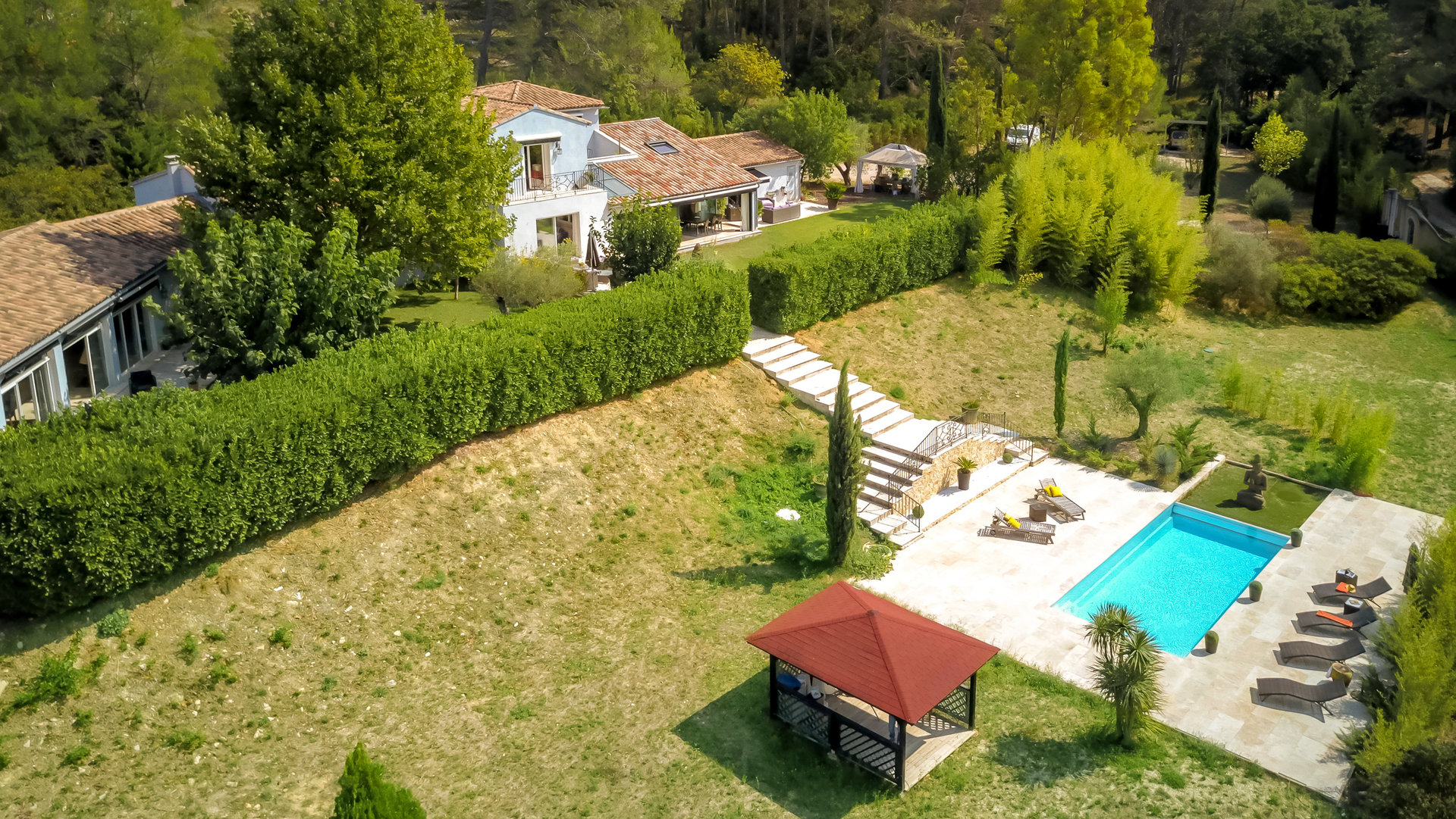 Un premier jardin intime entouré de haies vous invite à la détente bercé par l’ombre de ses arbres. En contre bas de la propriété, le jardin est accessible par un escalier au jeu de symétrie donnant accès à sa piscine à débordement dans une ambiance zen.