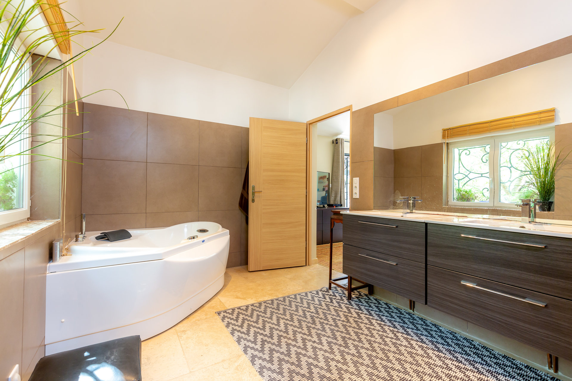La deuxième maison de plain pied est composée d’un salon/cuisine de plus de 80m2 ouvert sur le jardin. de trois chambres, une salle de bain, une salle d’eau, toilettes indépendantes, bureau, dressing, salon de lecture.