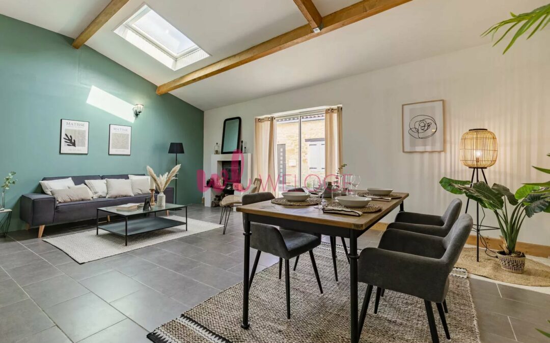 Il allie le charme de l’ancien et le contemporain, avec des matériaux et des prestations de qualité: cuisine haut de gamme entièrement équipée, bibliothèque encastrée, ancienne cheminée en pierre, sol en béton ciré, radiateur miroir, thermostat centralisé, haut-parleurs intégrés dans le plafond, baie de brassage… Il offre également une belle hauteur sous plafond.